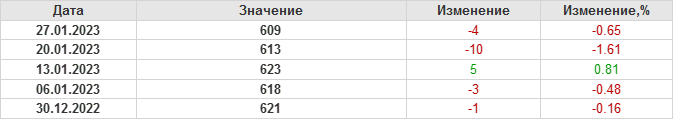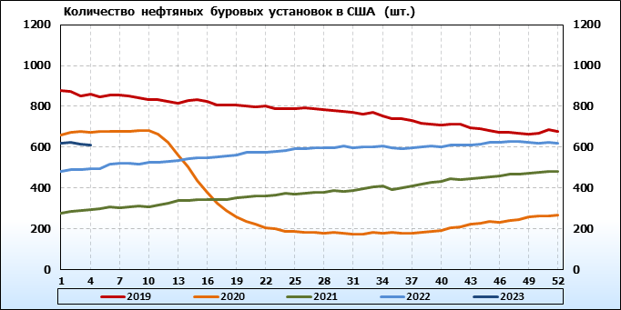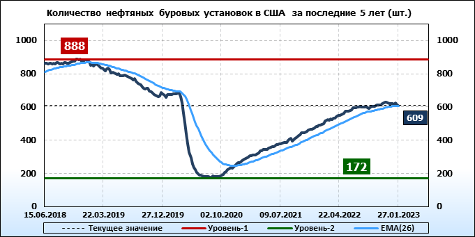 По сообщению Baker Hughes количество нефтяных буровых установок в США на 27.01.23 составило 609 штук. За неделю количество буровых установок упало на 4 единицы. На прошлой неделе количество установок, которые прекратили работу составило 5 единиц. Количество установок, которые ввели в эксплуатацию составило 1 единицу. Видим, что по итогам недели падение числа установок незначительное.
