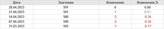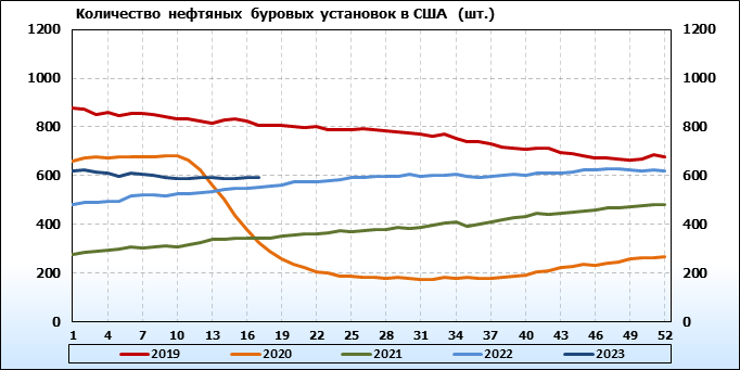 По сообщению Baker Hughes количество нефтяных буровых установок в США на 28.04.23 составило 591 штуку. За неделю количество буровых установок осталось неизменным. На прошлой неделе количество установок, которые прекратили работу составило 6 единиц. Количество установок, которые ввели в эксплуатацию составило 6 единиц.