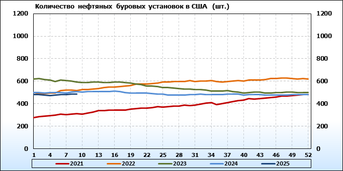 По сообщению Baker Hughes количество нефтяных буровых установок в США на 28.02.25 составило 486 штук. За неделю количество буровых установок упало на 2 единицы.