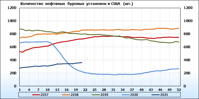 По сообщению Baker Hughes количество нефтяных буровых установок в США на 28.05.21 составило 359 штук. За неделю количество буровых установок выросло на 3 единицы. На прошлой неделе количество установок, которые прекратили работу составило 1 единицу. Количество установок, которые ввели в эксплуатацию составило 4 единицы. Как видим, рост числа установок есть, но он незначительный.