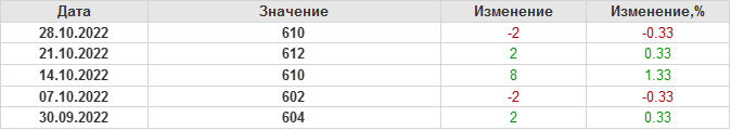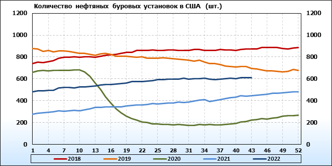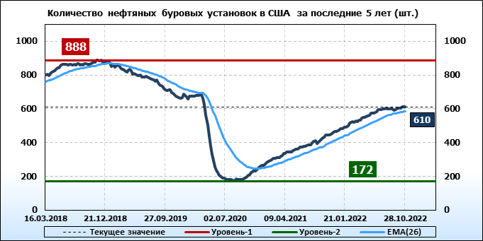 По сообщению Baker Hughes количество нефтяных буровых установок в США на 28.10.22 составило 610 штук. За неделю количество буровых установок упало на 2 единицы. На прошлой неделе количество установок, которые прекратили работу составило 7 единиц. Количество установок, которые ввели в эксплуатацию составило 5 единиц. Видим, что по итогам недели падение числа установок незначительное.