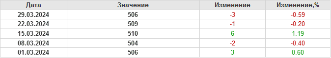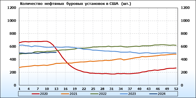 По сообщению Baker Hughes количество нефтяных буровых установок в США на 29.03.24 составило 506 штук. За неделю количество буровых установок упало на 3 единицы. На прошлой неделе количество установок, которые прекратили работу составило 4 единицы. Количество установок, которые ввели в эксплуатацию составило 1 единицу. Видим, что по итогам недели падение числа установок незначительное.