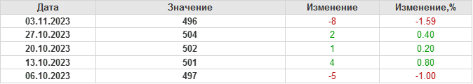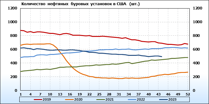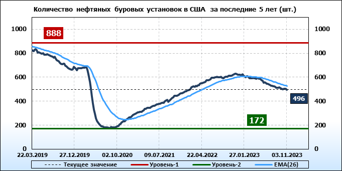 По сообщению Baker Hughes количество нефтяных буровых установок в США на 03.11.23 составило 496 штуки. За неделю количество буровых установок упало на 8 единиц. На прошлой неделе количество установок, которые прекратили работу составило 9 единиц. Количество установок, которые ввели в эксплуатацию составило 1 единицу. По итогам недели наблюдаем существенное сокращение буровых.