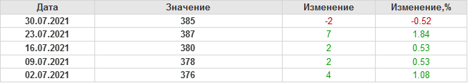 По сообщению Baker Hughes количество нефтяных буровых установок в США на 30.07.21 составило 385 штук. За неделю количество буровых установок упало на 2 единицы. На прошлой неделе количество установок, которые прекратили работу составило 5 единиц. Количество установок, которые ввели в эксплуатацию составило 3 единицы. Видим, что по итогам недели падение числа установок незначительное.