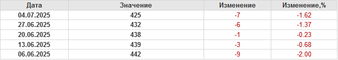 По сообщению Baker Hughes количество нефтяных буровых установок в США на 04.07.25 составило 425 штук. За неделю количество буровых установок упало на 7 единиц.