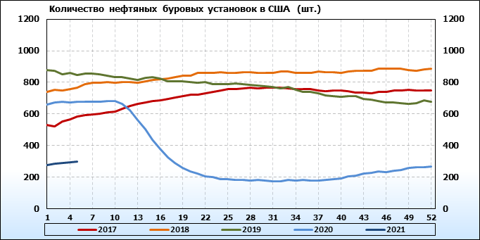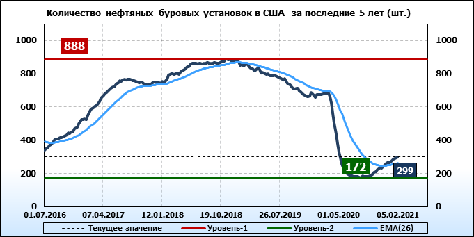 По сообщению Baker Hughes количество нефтяных буровых установок в США на 05.02.21 составило 299 штук. За неделю количество буровых установок выросло на 4 единицы. На прошлой неделе количество установок, которые прекратили работу составило 2 единицы. Количество установок, которые ввели в эксплуатацию составило 6 единиц. Как видим, рост числа установок есть, но он незначительный.