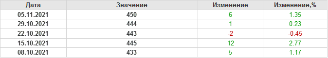 По сообщению Baker Hughes количество нефтяных буровых установок в США на 05.11.21 составило 450 штук. За неделю количество буровых установок выросло на 6 единиц. На прошлой неделе количество установок, которые прекратили работу составило 2 единицы. Количество установок, которые ввели в эксплуатацию составило 8 единиц. Как видим, рост числа установок есть, но он незначительный.