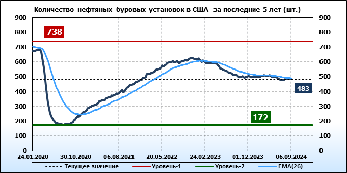 По сообщению Baker Hughes количество нефтяных буровых установок в США на 06.09.24 составило 483 штуки. За неделю количество буровых установок осталось неизменным.