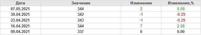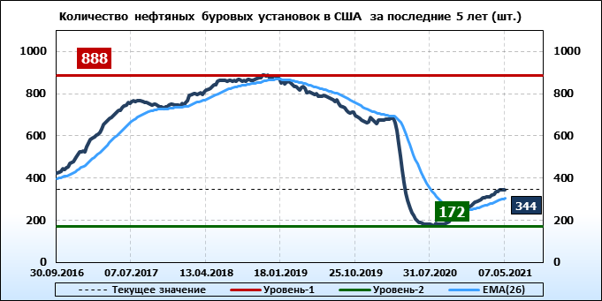 По сообщению Baker Hughes количество нефтяных буровых установок в США на 07.05.21 составило 344 штуки. За неделю количество буровых установок выросло на 2 единицы. На прошлой неделе количество установок, которые прекратили работу составило 3 единицы. Количество установок, которые ввели в эксплуатацию составило 5 единиц. Как видим, рост числа установок есть, но он незначительный.