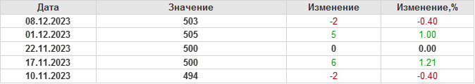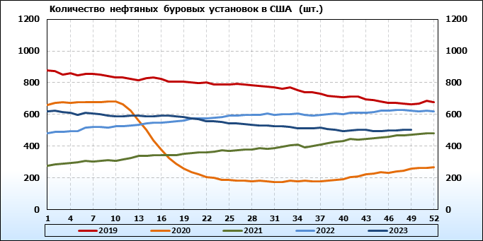По сообщению Baker Hughes количество нефтяных буровых установок в США на 08.12.23 составило 503 штуки. За неделю количество буровых установок упало на 2 единицы. На прошлой неделе количество установок, которые прекратили работу составило 6 единиц. Количество установок, которые ввели в эксплуатацию составило 4 единицы. Видим, что по итогам недели падение числа установок незначительное.