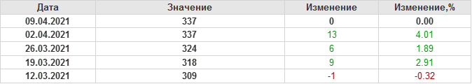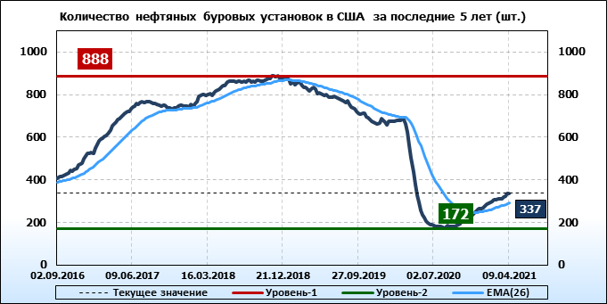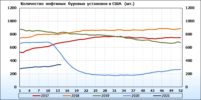 По сообщению Baker Hughes количество нефтяных буровых установок в США на 09.04.21 составило 337 штук. За неделю количество буровых установок осталось неизменным. На прошлой неделе количество установок, которые прекратили работу составило 1 единицу. Количество установок, которые ввели в эксплуатацию составило 1 единицу.