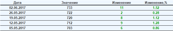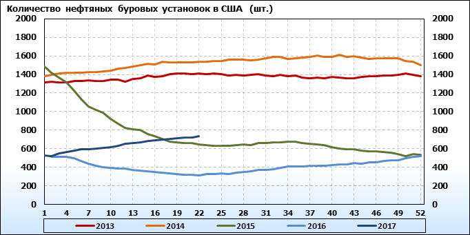 По сообщению Baker Hughes количество нефтяных буровых установок в США на 2.06.2017 составило 733 штук. За неделю количество буровых, добывающих нефть выросло на 11 единиц. На прошлой неделе количество установок, которые прекратили добычу составило 1 единицу. Количество установок, которые ввели в эксплуатацию составило 12 единиц. По итогам недели рост количества установок очевиден.