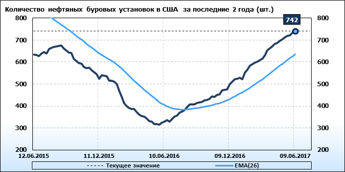 По сообщению Baker Hughes количество нефтяных буровых установок в США на 9.06.2017 составило 742 штук. За неделю количество буровых, добывающих нефть выросло на 8 единиц. На прошлой неделе количество установок, которые прекратили добычу составило 5 единиц. Количество установок, которые ввели в эксплуатацию составило 13 единиц. По итогам недели рост количества установок очевиден.