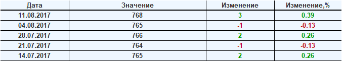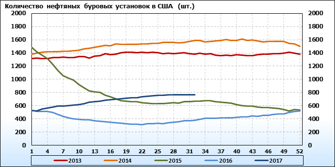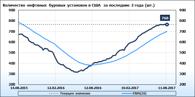 По сообщению Baker Hughes количество нефтяных буровых установок в США на 11.08.2017 составило 768 штук. За неделю количество буровых установок выросло на 3 единицы. На прошлой неделе количество установок, которые прекратили работу составило 4 единицы. Количество установок, которые ввели в эксплуатацию составило 7 единиц. Как видим, рост числа установок есть, но он незначительный.