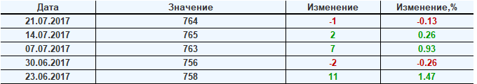 По сообщению Baker Hughes количество нефтяных буровых установок в США на 21.07.2017 составило 764 штуки. За неделю количество буровых установок упало на одну единицу. На прошлой неделе количество установок, которые прекратили работу составило 5 единиц. Количество установок, которые ввели в эксплуатацию составило 4 единицы. Видим, что по итогам недели падение числа установок незначительное.