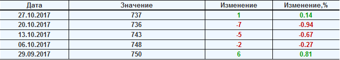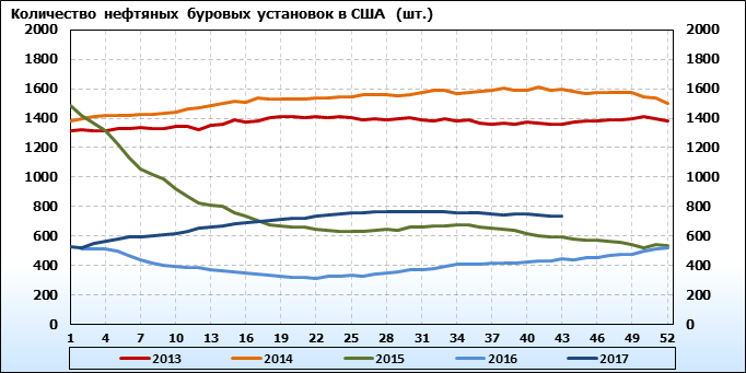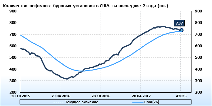 По сообщению Baker Hughes количество нефтяных буровых установок в США на 27.10.2017 составило 737 штук. За неделю количество буровых установок выросло на 1 единиц. На прошлой неделе количество установок, которые прекратили работу составило 5 единиц. Количество установок, которые ввели в эксплуатацию составило 6 единиц. Как видим, рост числа установок есть, но он незначительный.