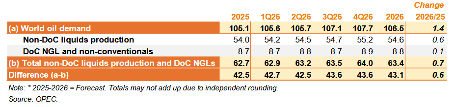 Спрос на нефть DoC в 2026 году также не изменился по сравнению с предыдущим месяцем и составил 43,1 млн баррелей в сутки, что примерно на 0,6 млн баррелей в сутки выше прогноза на 2025 год.
