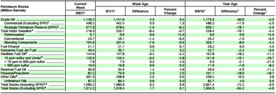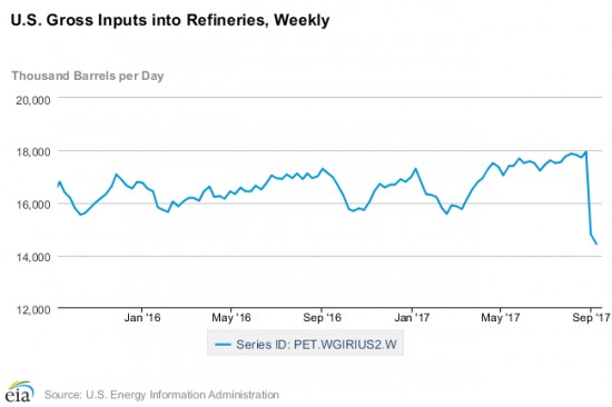 В первую очередь потому что произошло восстановление объемов добычи сырой нефти. А объем нефти поступающий на переработку не изменился и составил 14,435 млн. баррелей в сутки. Ниже по графику видно, как резко сократился объем нефтепереработки в США благодаря урагану Харви.