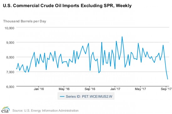 Теперь Соединенные Штаты не нуждаются в сырой нефти. Как это было до урагана. Это облегчило штатам жизнь в настоящее время потому что на фоне войны между производителями нефти и потребителями, их импорт чувствует себя свободно, а необходимость снизилась со средних значений около 8 млн. баррелей в сутки до 6,5 млн баррелей в сутки.