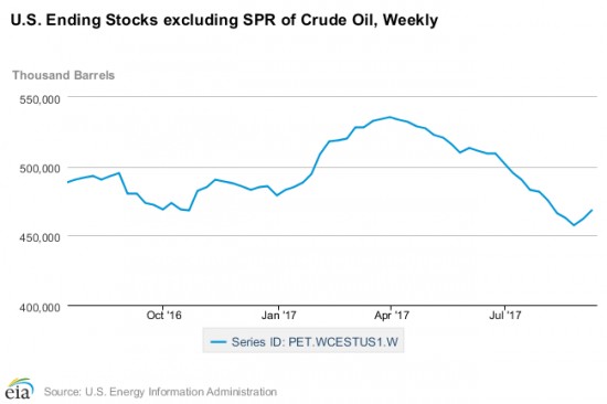 Вообще штатам более выгоден второй сценарий. До урагана в Соединенных штатах ежесуточно не хватало примерно 1 млн. баррелей сырой нефти, это отражали данные по запасам, которые падали с апреля этого года 5 месяцев подряд, на графике ниже это видно.