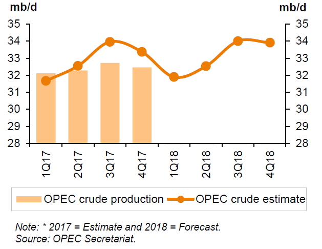 Добыча нефти ОПЕК в 2017 году оценивается в 32,9 млн брл/сут, что на 0,6 млн брл/сут выше уровня 2016 года. Прогноз на 2018 год составляет 33,1 млн брл/сут, что примерно на 0,2 млн брл/сут больше, чем годом ранее. Ожидается, что во второй половине 2018 года будет достигнут уровень в почти 34 млн брл/сут.