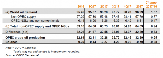 Добыча нефти ОПЕК в 2017 году была пересмотрена в сторону повышения на 0,1 млн брл/сут по сравнению с предыдущим месяцем до 32,9 млн брл/сут, что представляет собой увеличение на 0,6 млн брл/сут по сравнению с предыдущим годом.