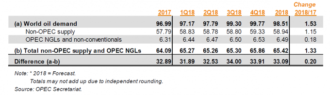 Прогноз добычи нефти ОПЕК на 2018 год был снижен на 0,1 млн брл/сут по сравнению с предыдущим отчетом до 33,1 млн брл/сут, что на 0,2 млн брл/сут выше уровня 2017 года. Если оценивать поквартально, то первый и второй квартал были пересмотрены в сторону понижения на 0,1 млн брл/сут, тогда как третий и четвертый кварталы остались без изменений.