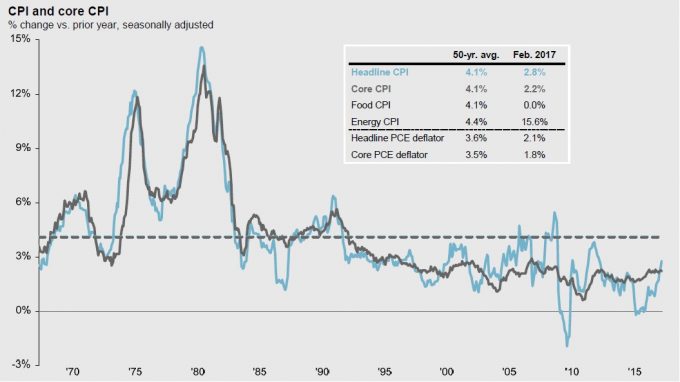 Индекс потребительских цен (базовая инфляция) медленно растет, что является следствием слабых темпов увеличения уровня зарплат. Однако, улучшение ситуации на рынке труда может способствовать росту показателей базовой инфляции в 2017 году. В то же время, рост цен на нефть способствовал достижению уровня инфляции 2.8 процента по состоянию на февраль 2017 года. Не менее важно, что инфляция, рассчитанная с помощью дефлятора расходов на личное потребление, быстро приближается к планируемому Федеральной резервной системой двухпроцентному показателю.