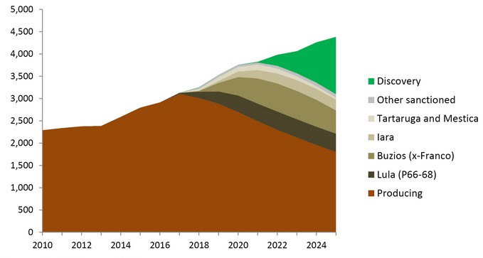 Показатели объемов производства после 2020 года полностью зависят от того, удастся ли вовремя начать освоение недавно открытых месторождений природных ресурсов. Аналитики полагают, что в период с 2020 по 2025 годы годовой показатель прироста объемов производства составит 3%. Это станет возможным благодаря запуску работ на проектах Sepia, Libra и Marlim. Крупнейшим из этих проектов является Libra. Планируется, что работы на нем начнутся в 2022 году, и к 2025 году объемы добычи на месторождении составят 400 тыс. boe/d.