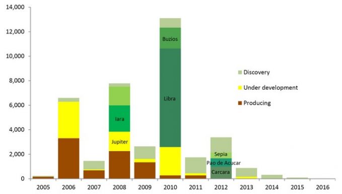На рисунке 2 изображены объемы обнаруженных в период с 2005 по 2016 годы природных ресурсов. Лучшим годом в плане открытия месторождений стал 2010, когда были разведаны около 13 млрд. boe (почти все — в море в Santos Basin). При этом, более 90% от общего объема открытых ресурсов содержатся в месторождениях Libra и Buzios. Другими крупными месторождениями являются Lula (2006 и 2009 годы), Iara, Jupiter и Sapinhoa (2008 год). С 2010 года объемы разведанных месторождений сократились. 2012 год стал исключением из этого правила, когда компания Petrobras открыла месторождения Carcara и Pao de Acucar (теперь они управляются Statoil). С тех пор, новые ресурсы почти не разведывались. Тем не менее, в ближайшее время ожидается серьезный прирост объемов производства благодаря сделанным за последние 12 лет открытиям.