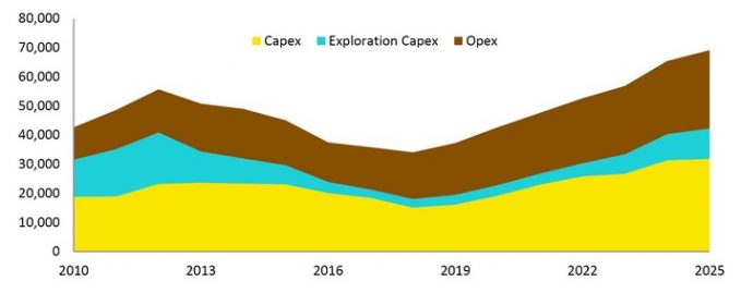 На рисунке изображен общий показатель затрат в нефтегазовой отрасли в Бразилии в период с 2010 по 2025 годы. Капитальные вложения и капитальные затраты на геологоразведку сократились на 19% в прошлом году, и в 2018 году, предположительно, сократятся еще на 13%. Общий объем капиталовложений в следующем году, предположительно, сократится с $21 млрд. до $18 млрд. Запуск производства на месторождениях Lula и Sapinhoa, где значительная часть затрат на разработку уже была понесена, равно как коррупционные скандалы, а также снижение цен на нефть влекут сокращение объемов инвестирования в период с 2016 по 2018 годы.