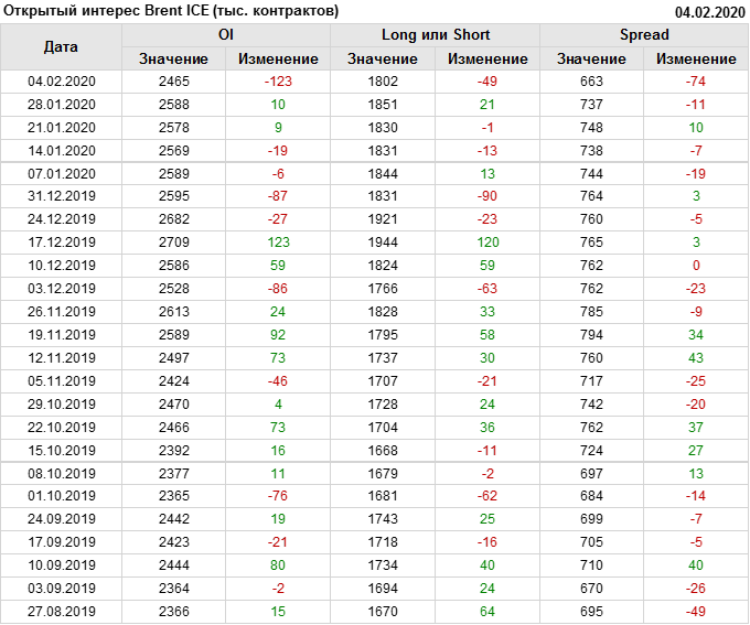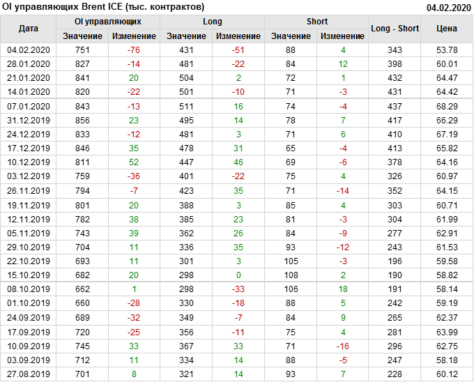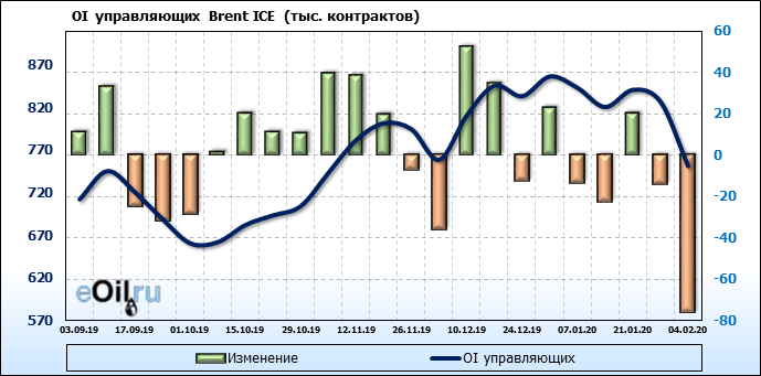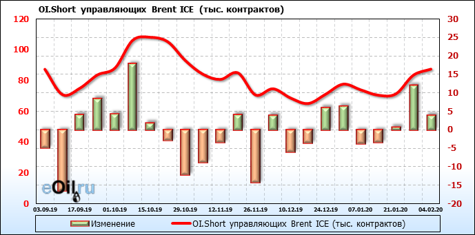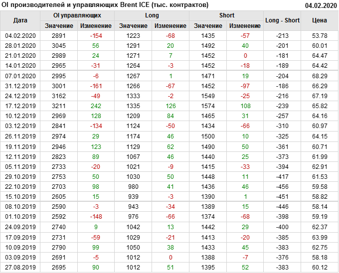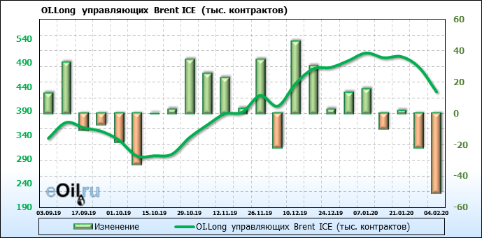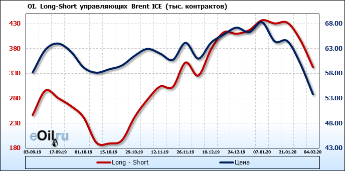 За прошлую неделю, 29.01.20 — 04.02.20, разница между длинными и короткими позициями управляющих упала на 55 тыс. контрактов. В тоже время, цена упала на 6.23 доллара. Наращивание коротких позиций спекулянтами приводит к падению цен. Если давление со стороны медведей продолжится, то мы можем увидеть новые минимумы.