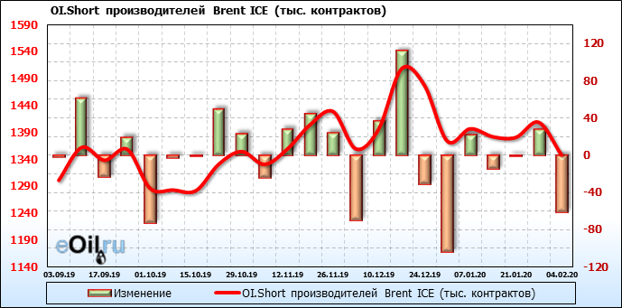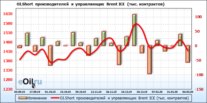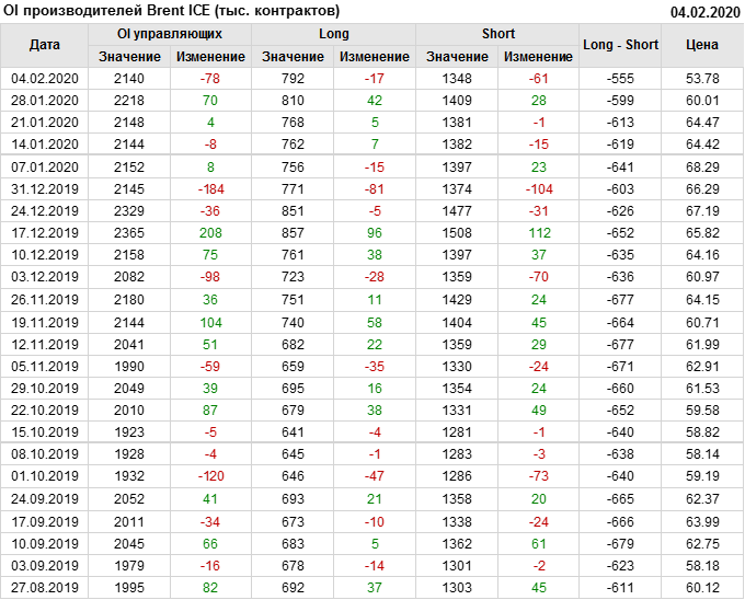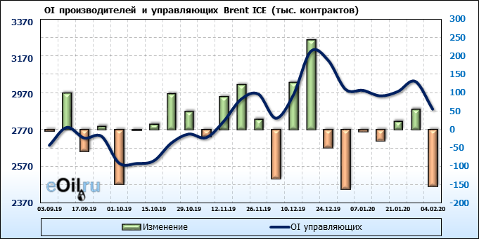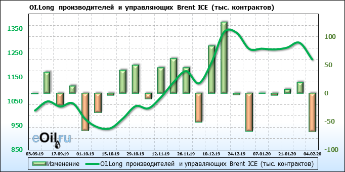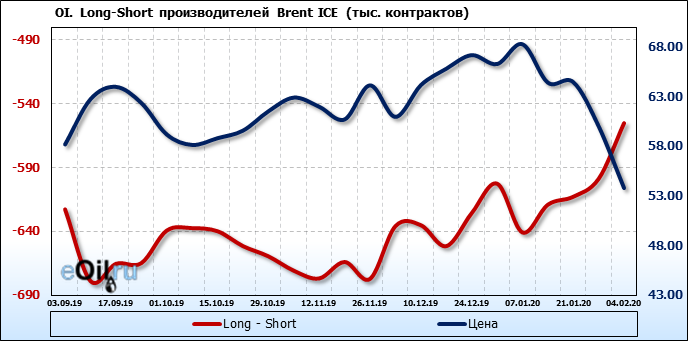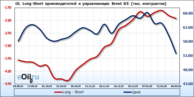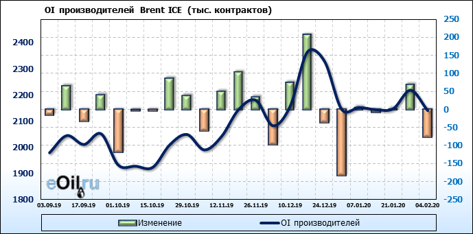 За прошлую неделю, 29.01.20 — 04.02.20, разница между длинными и короткими позициями производителей выросла на 44 тыс. контрактов. В тоже время, цена упала на 6.23 доллара. Производители перестали наращивать короткие позиции, что говорит или о непривлекательности текущих ценовых уровней для хеджирования, или о том, что часть участников рынка заняла выжидательную позицию.