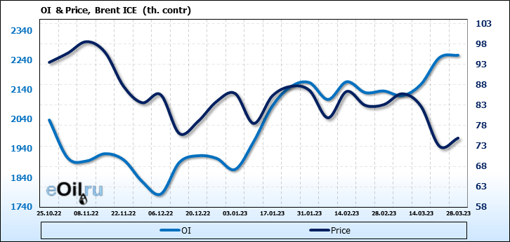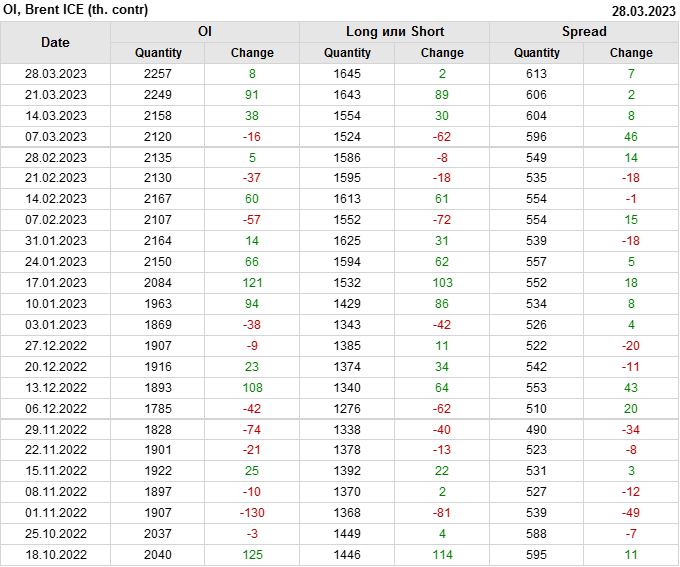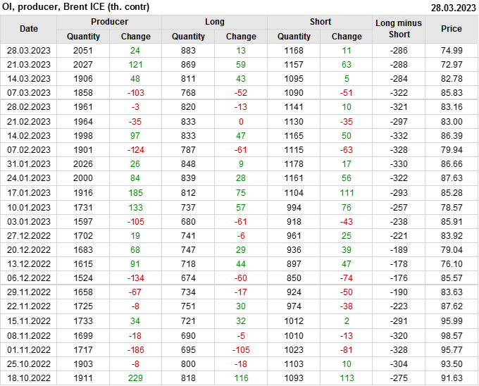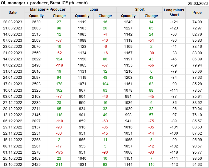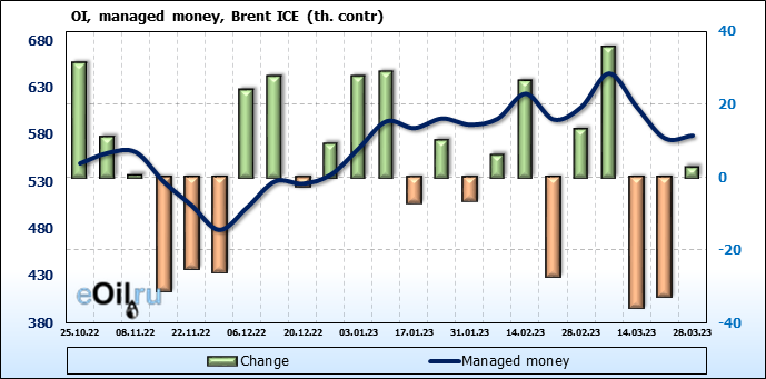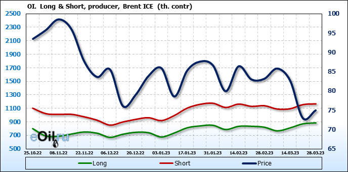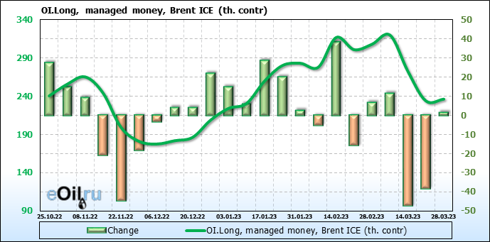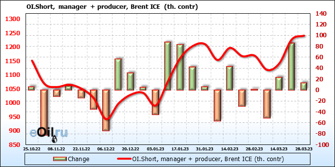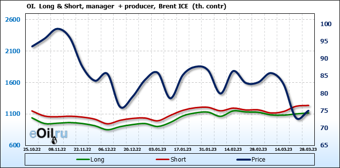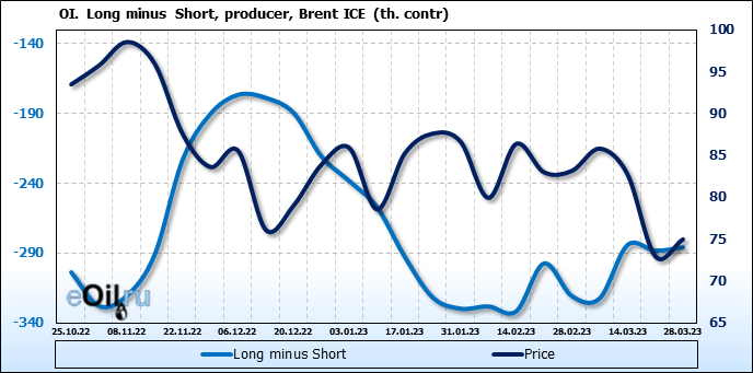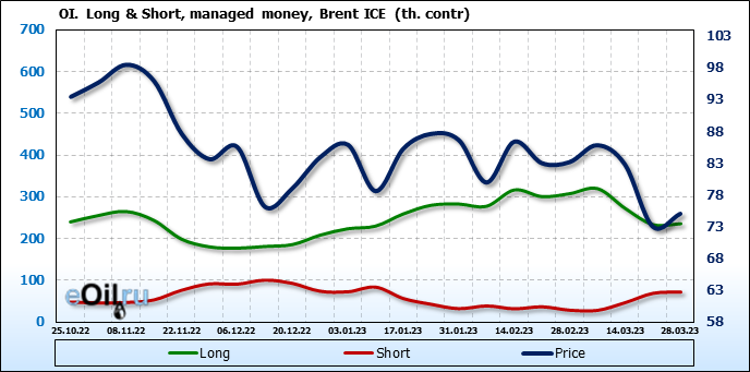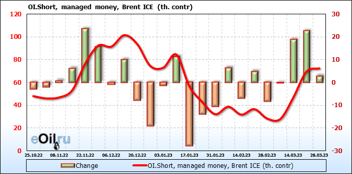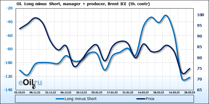 За прошедшую неделю, 22.03.23 — 28.03.23, разница между длинными и короткими позициями управляющих сократилась на 0.5 тыс. контрактов. В тоже время, цена выросла на 2.02 доллара.