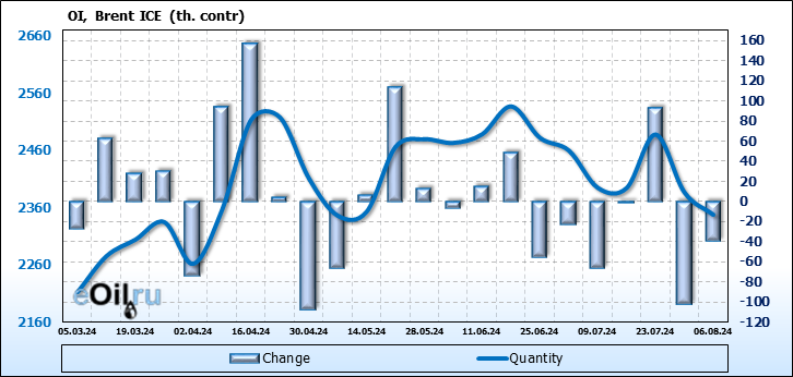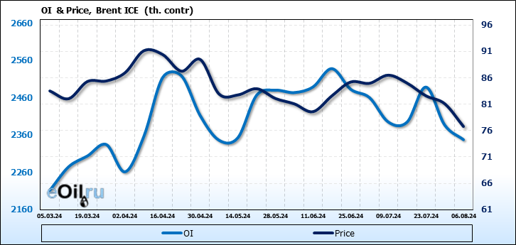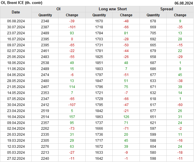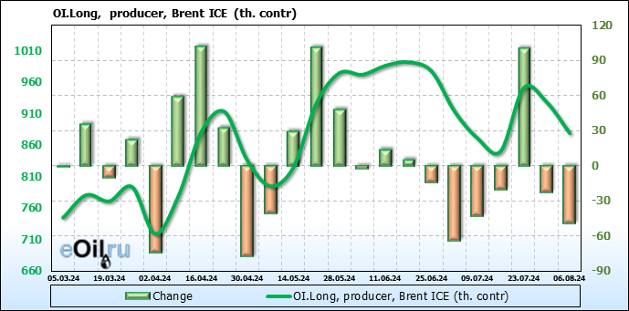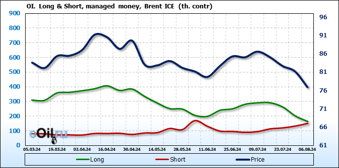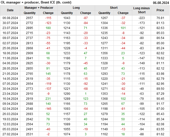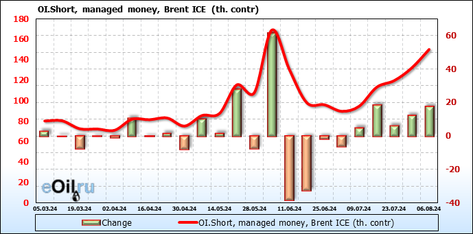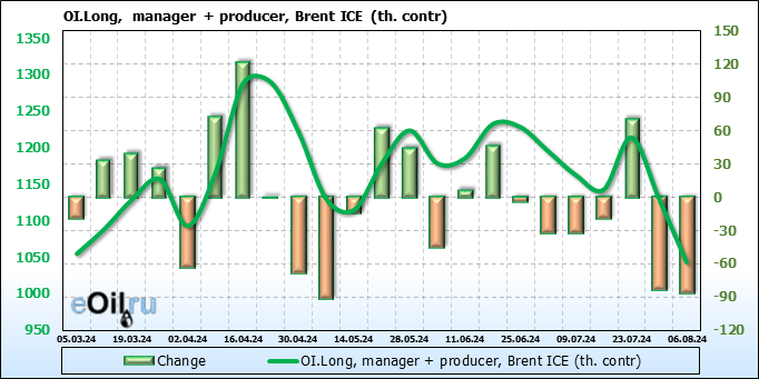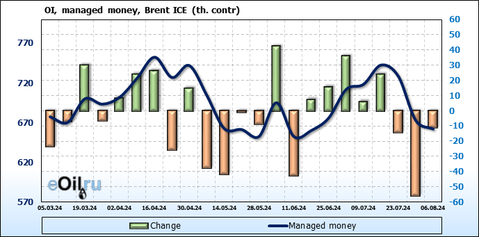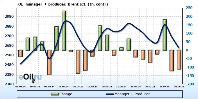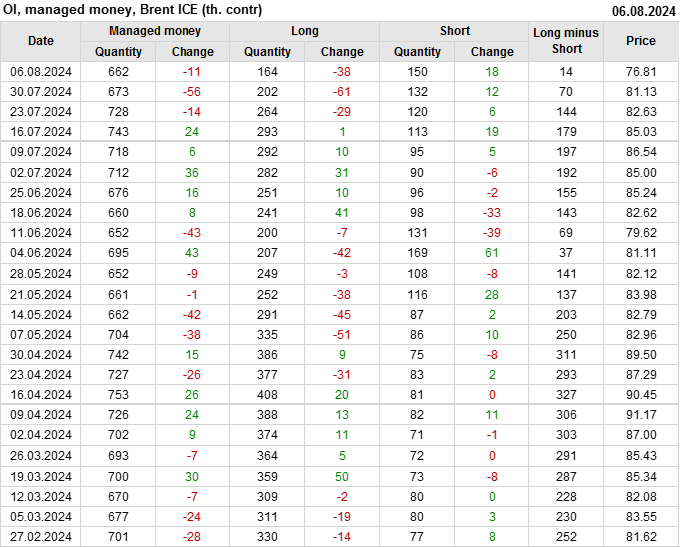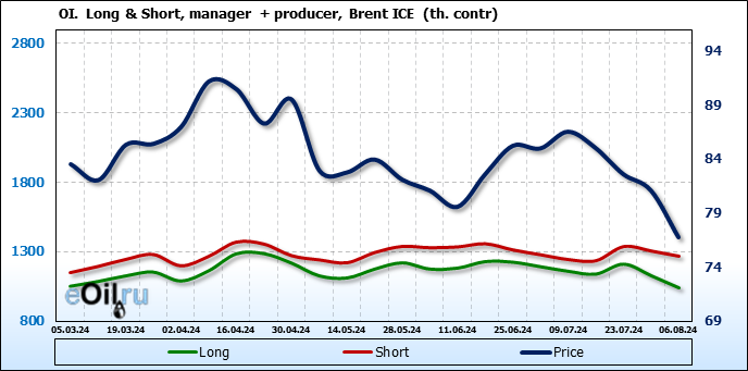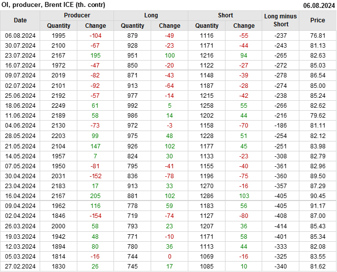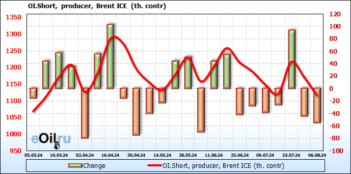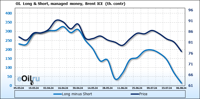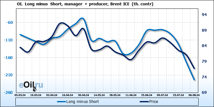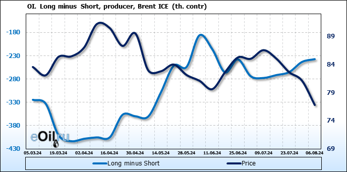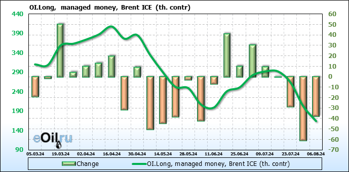 За прошедшую неделю, 31.07.24 — 06.08.24, разница между длинными и короткими позициями управляющих сократилась на 56.2 тыс. контрактов. В тоже время, цена упала на 4.32 доллара.