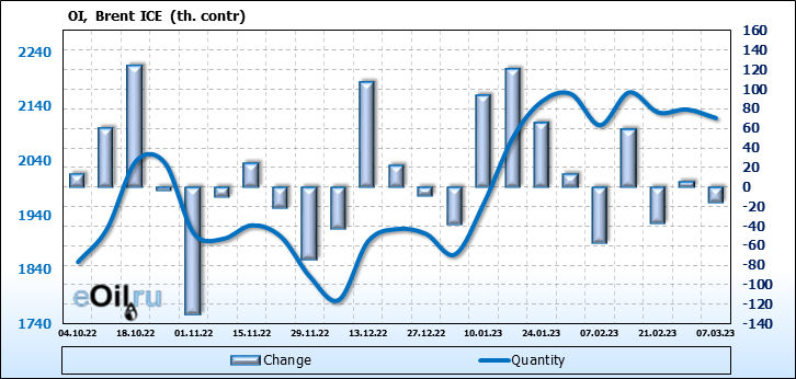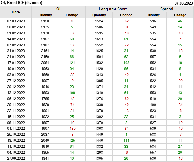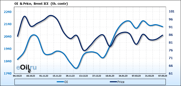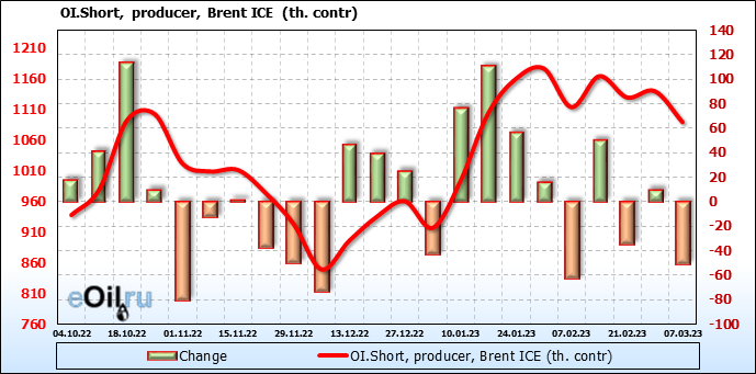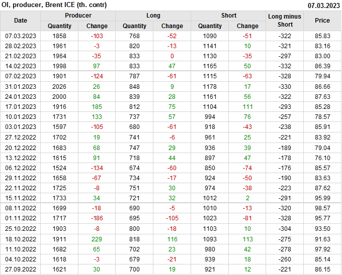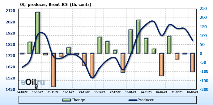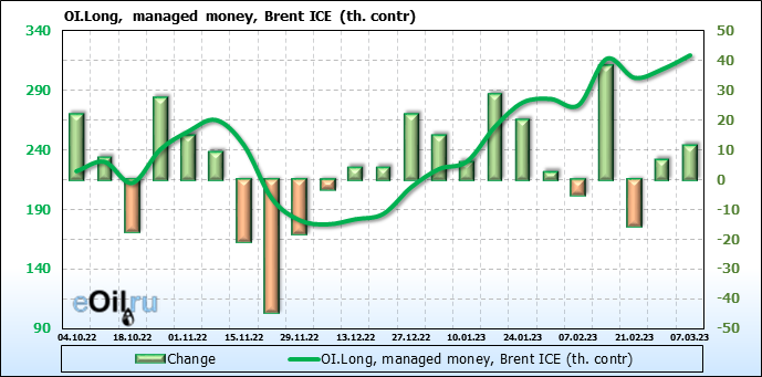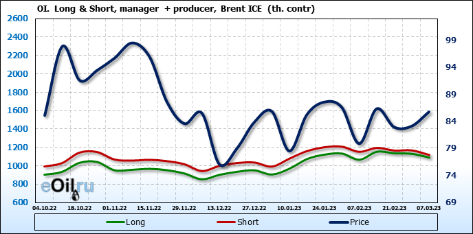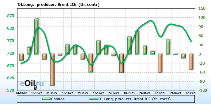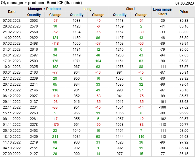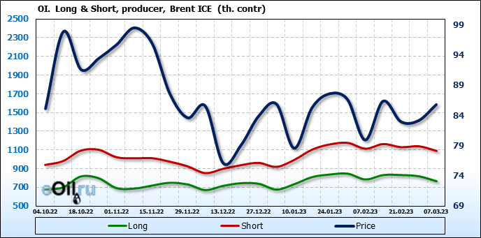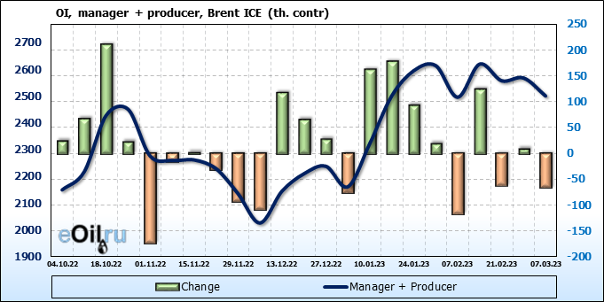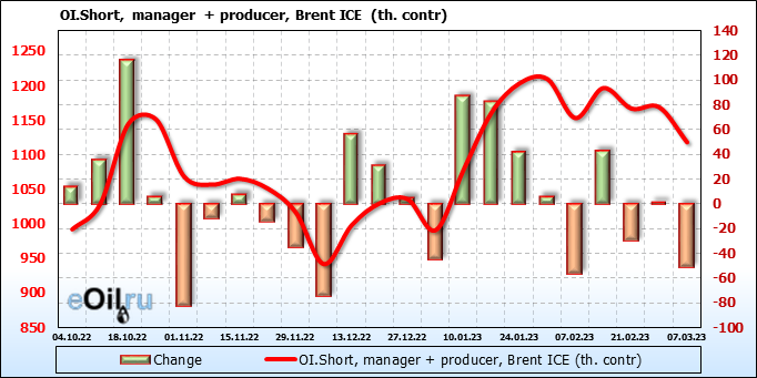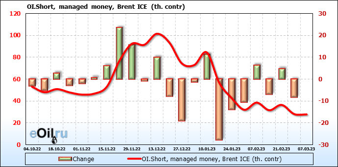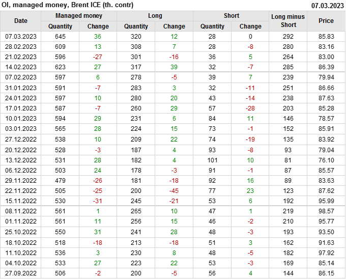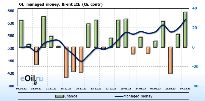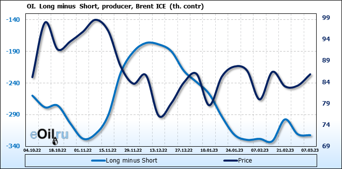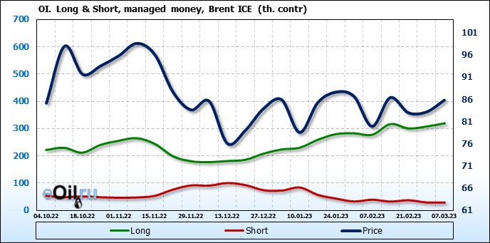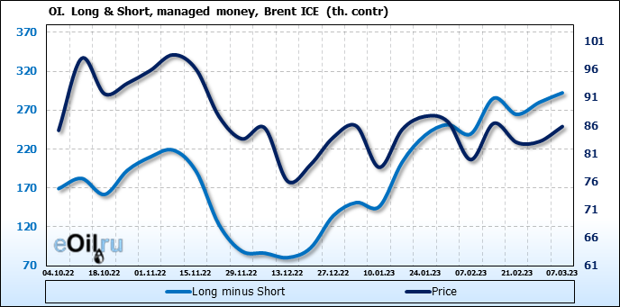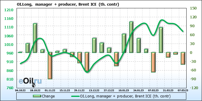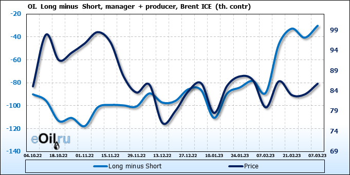 За прошедшую неделю, 01.03.23 — 07.03.23, разница между длинными и короткими позициями управляющих увеличилась на 12.1 тыс. контрактов. В тоже время, цена выросла на 2.67 доллара.