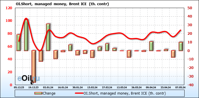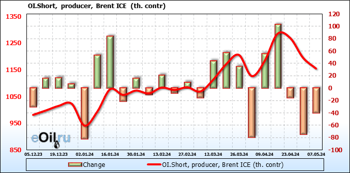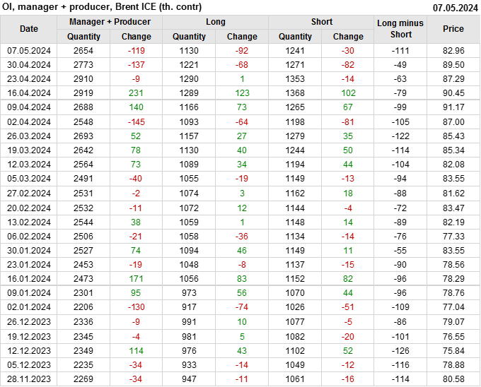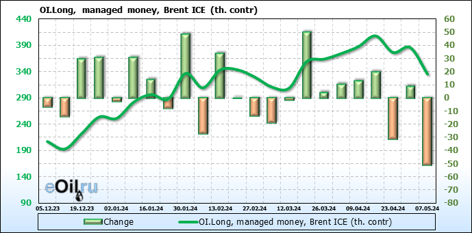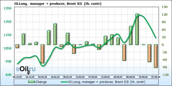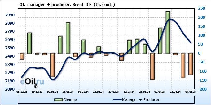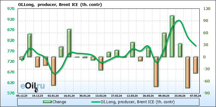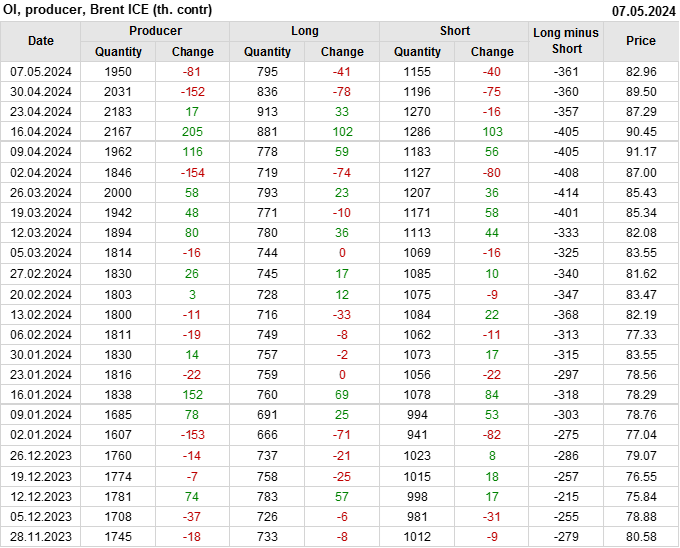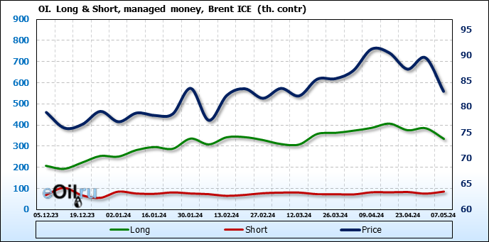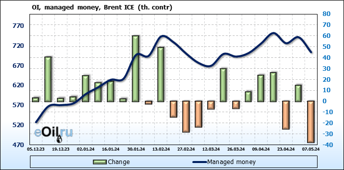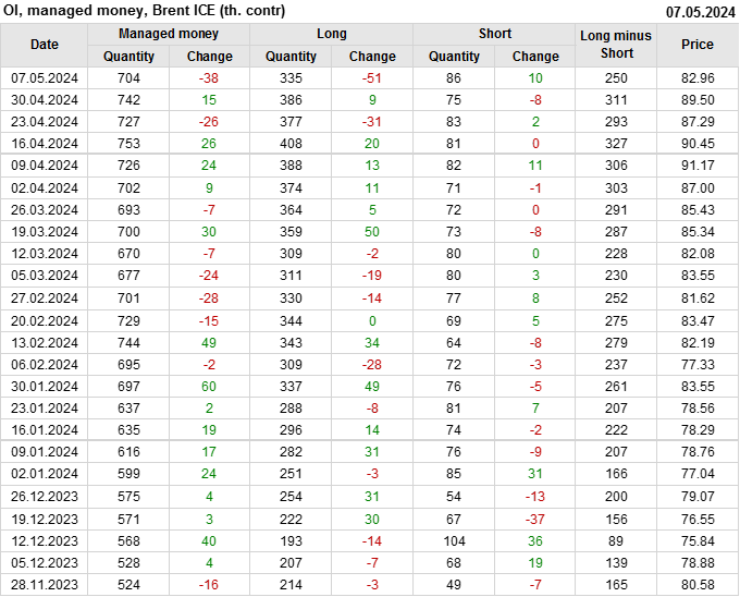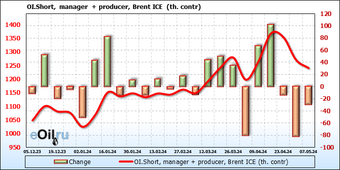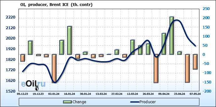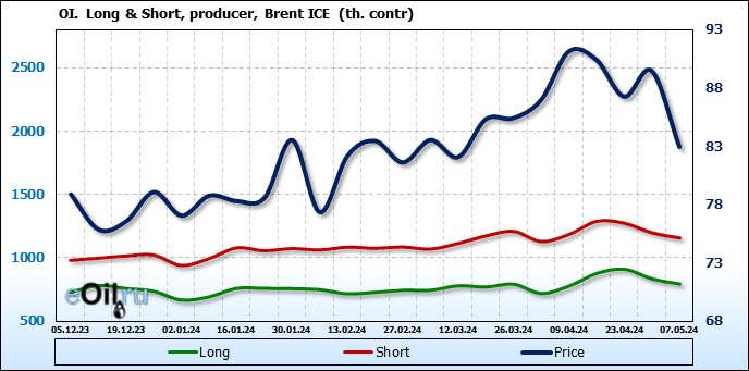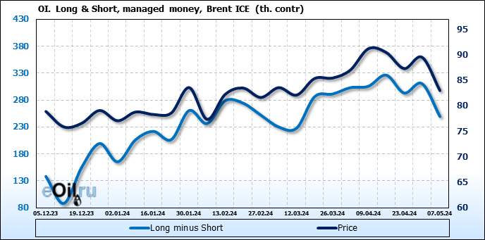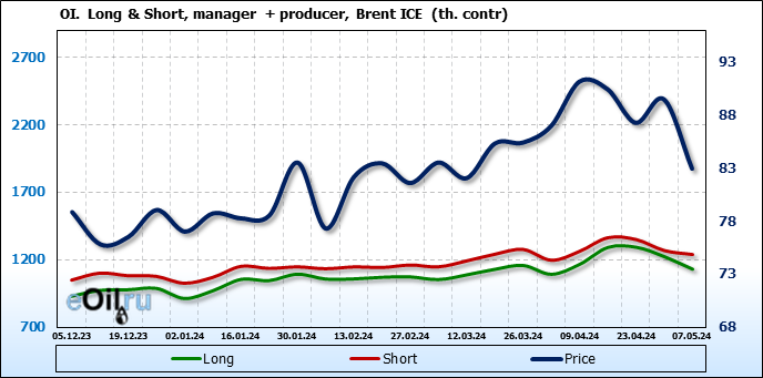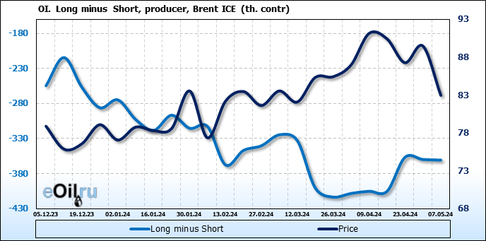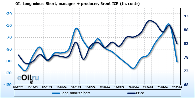 За прошедшую неделю, 01.05.24 — 07.05.24, разница между длинными и короткими позициями управляющих сократилась на 61 тыс. контрактов. В тоже время, цена упала на 6.54 доллара.