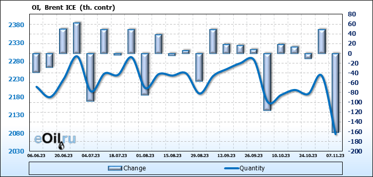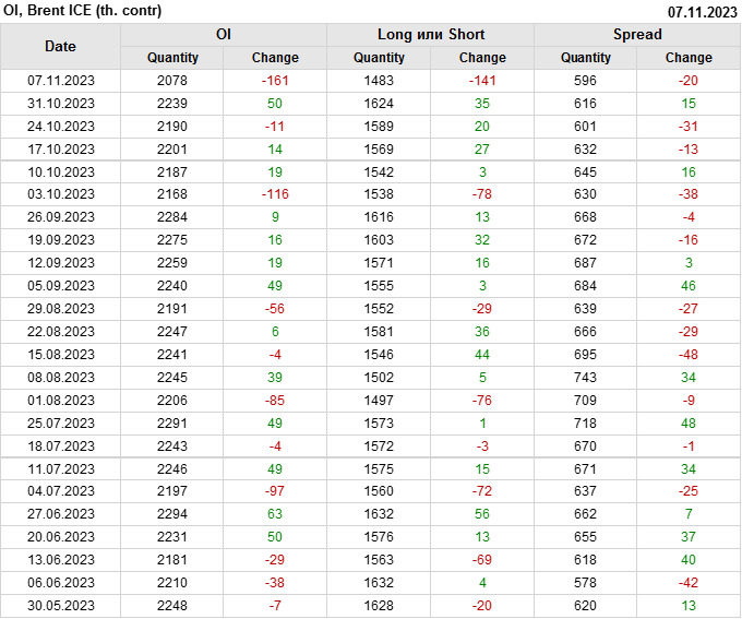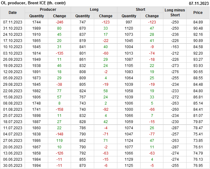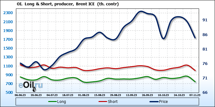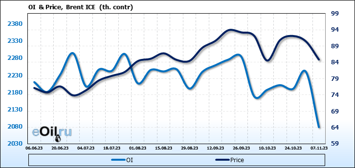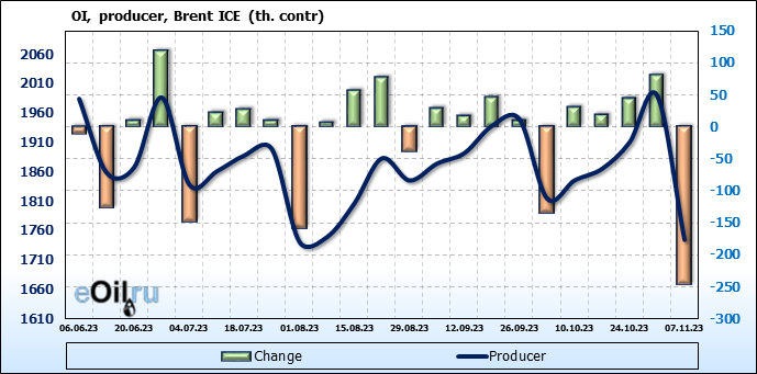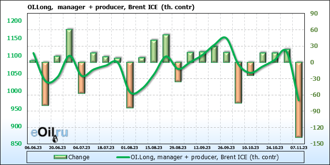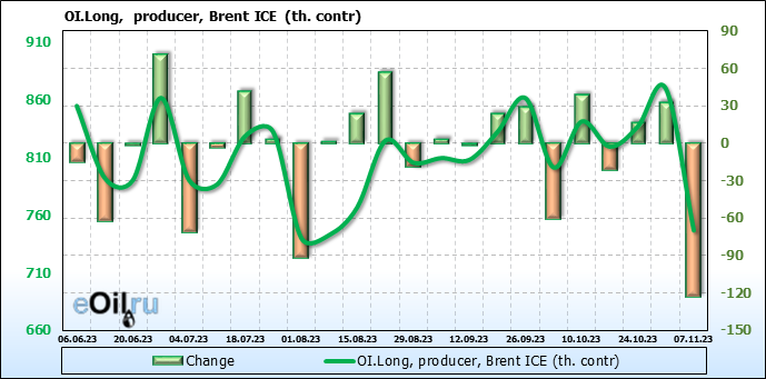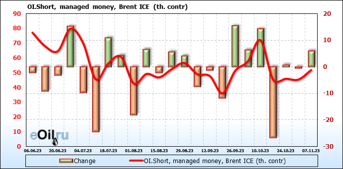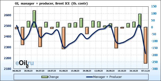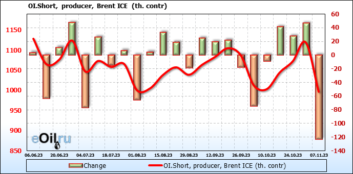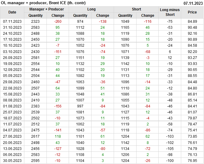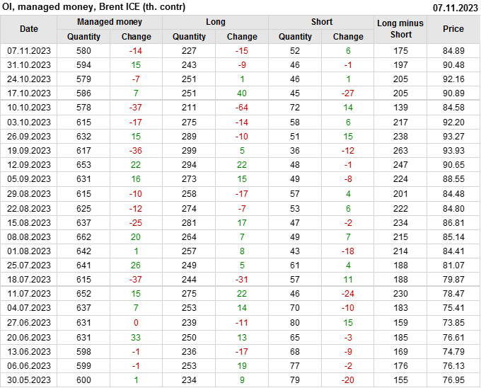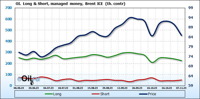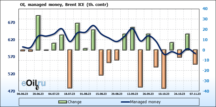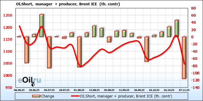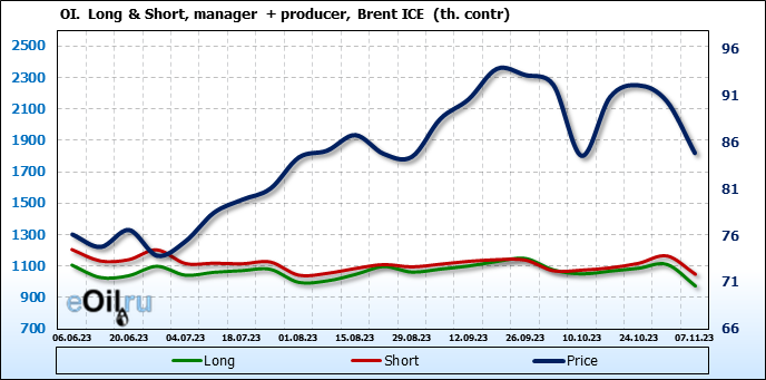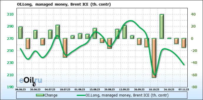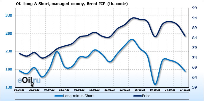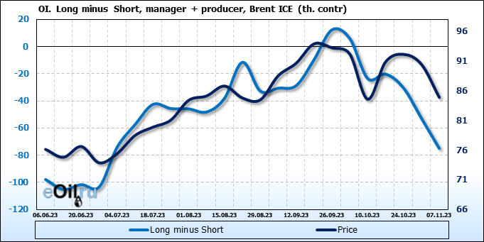 За прошедшую неделю, 01.11.23 — 07.11.23, разница между длинными и короткими позициями управляющих сократилась на 21.7 тыс. контрактов. В тоже время, цена упала на 5.59 доллара.