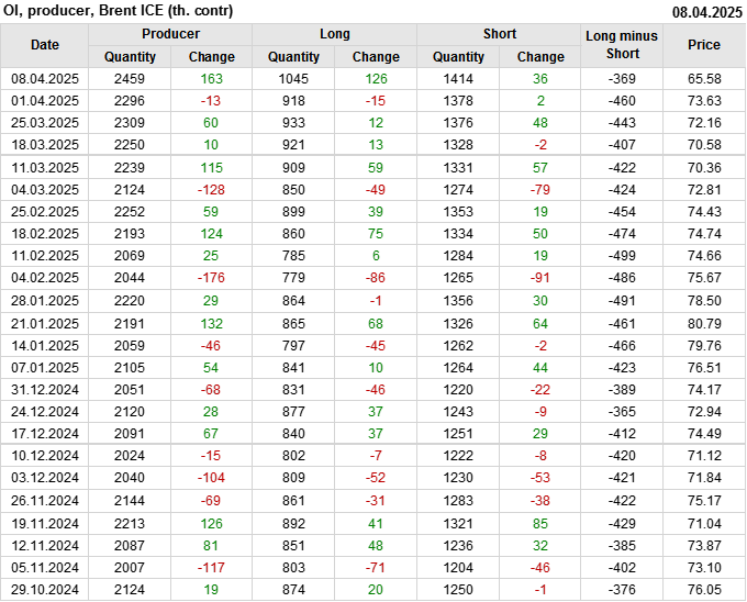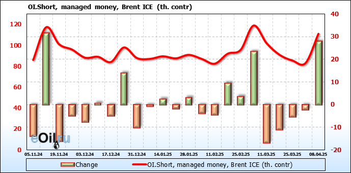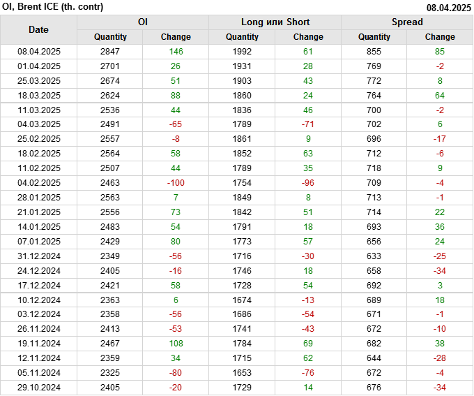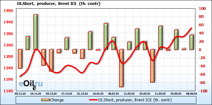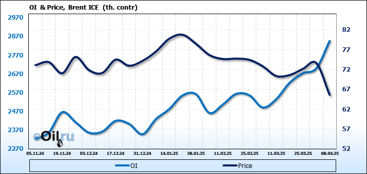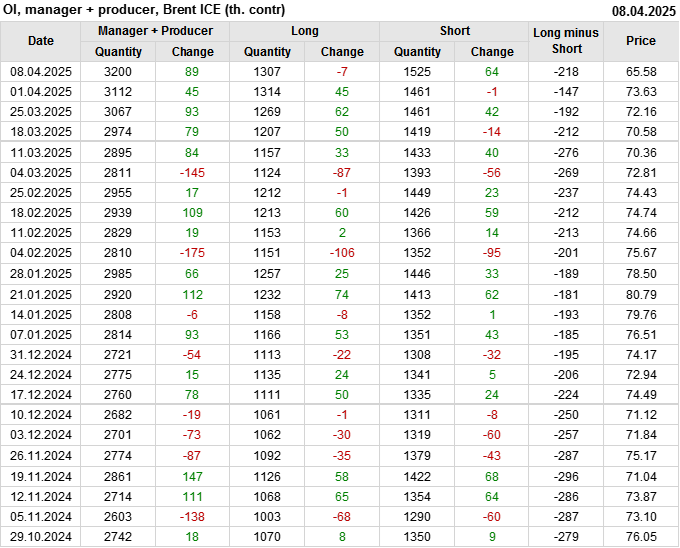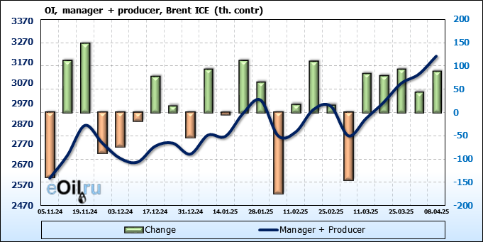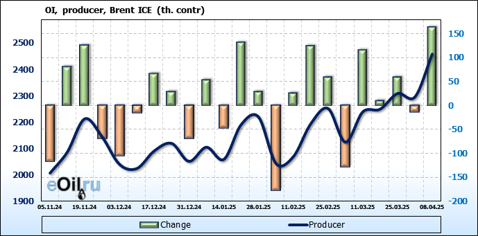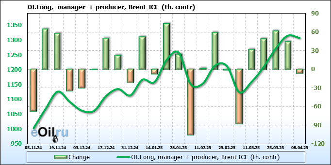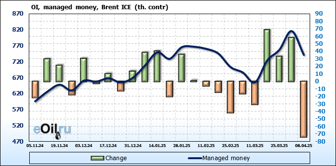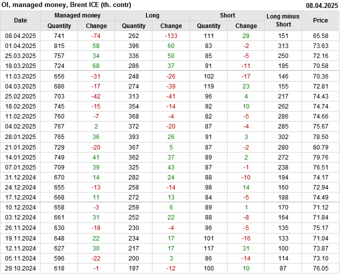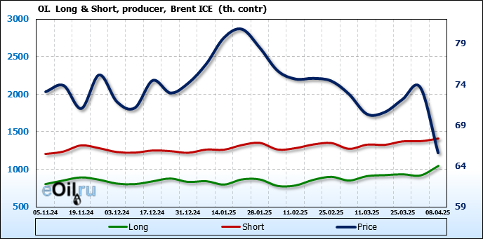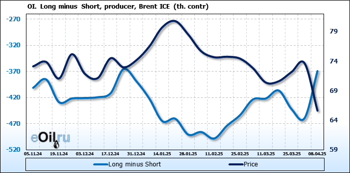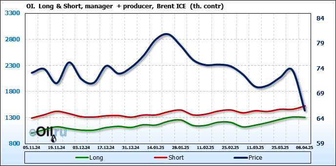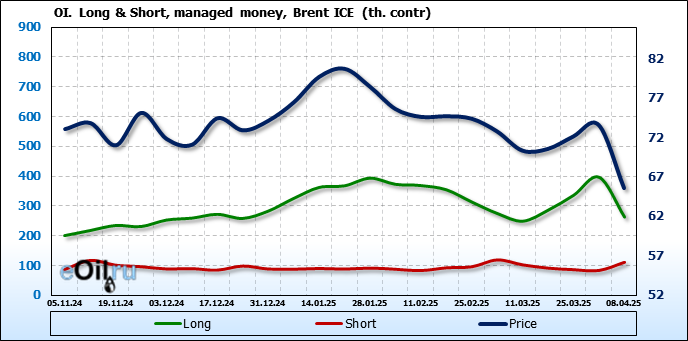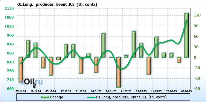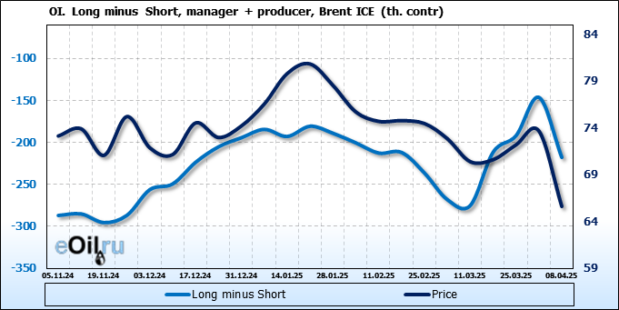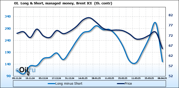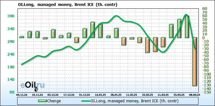 За прошедшую неделю, 02.04.25 — 08.04.25, разница между длинными и короткими позициями управляющих сократилась на 161.5 тыс. контрактов. В тоже время, цена упала на 8.05 доллара.
