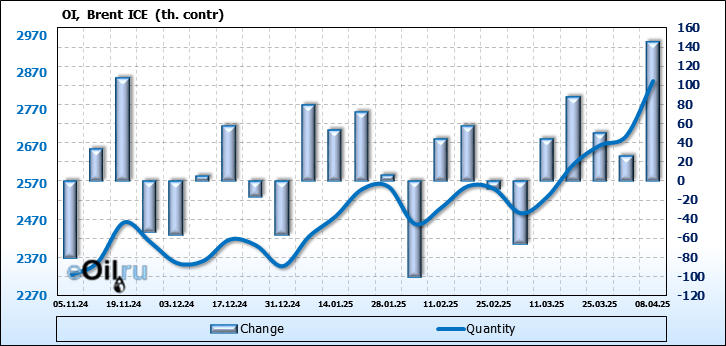 За прошедшую неделю, 02.04.25 — 08.04.25, открытый интерес вырос на 146 тыс. контрактов. Объем вовлеченных в торговлю контрактов составляет 2 847 024 штуки. Текущее положение дел на рынке таково, что деньги в течение прошлой недели приходили на рынок поддерживая тенденцию.