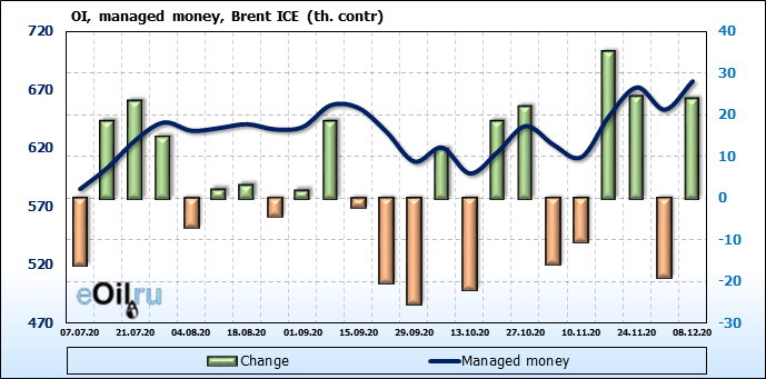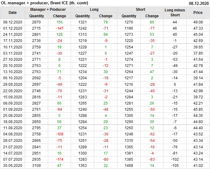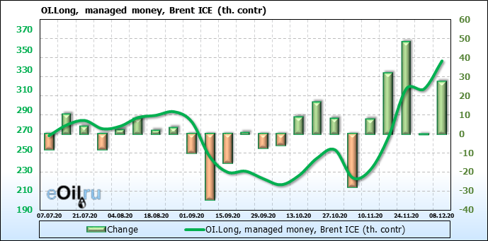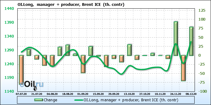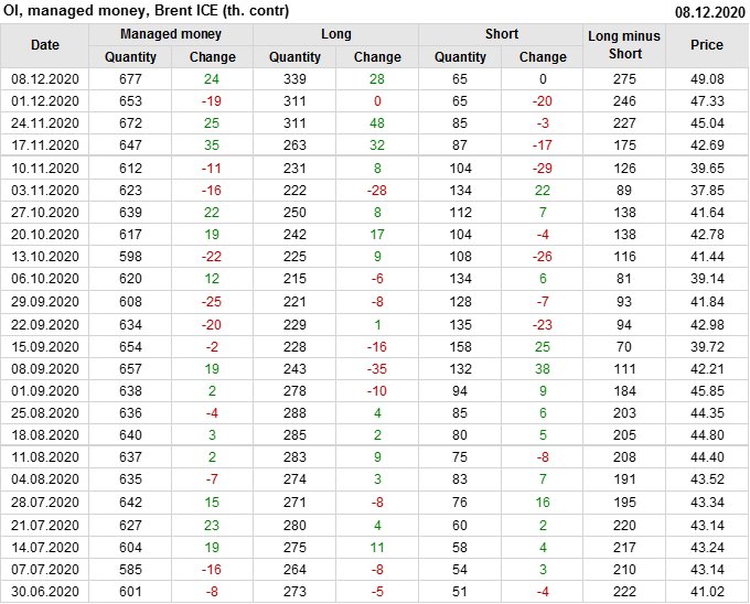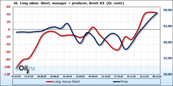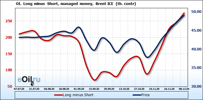 За прошлую неделю, 02.12.20 — 08.12.20, разница между длинными и короткими позициями управляющих выросла на 28 тыс. контрактов. В тоже время, цена выросла на 1.75 доллара. Управляющие наращивают позиции, разгоняя тем самым рост цен, что говорит нам о текущей силе рынка.