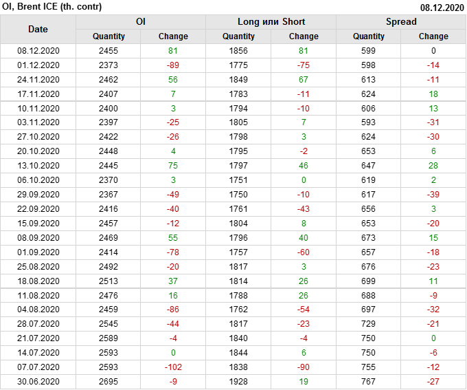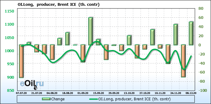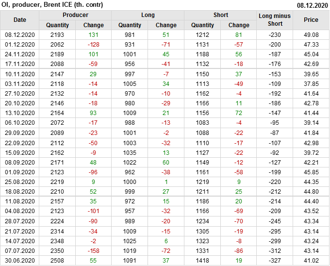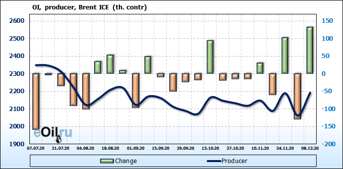 За прошлую неделю, 02.12.20 — 08.12.20, разница между длинными и короткими позициями производителей упала на 30 тыс. контрактов. В тоже время, цена выросла на 1.75 доллара. Производители увеличивают продажи, предполагая, что текущие уровни являются привлекательными для них. И не смотря на это, рынок продолжает расти, что показывает силу текущего тренда.
