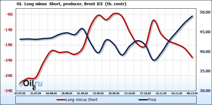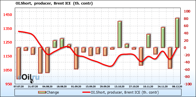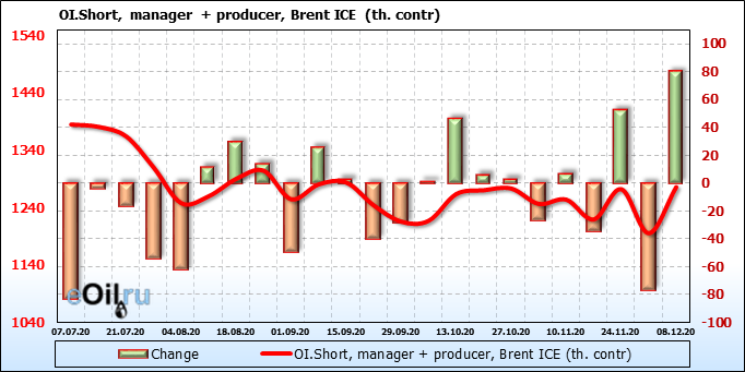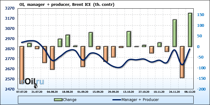 За прошлую неделю, 02.12.20 — 08.12.20, разница между длинными и короткими позициями производителей и управляющих упала на 2 тыс. контрактов. За отчетный период времени, цена выросла на 1.75 доллара. Разница совокупного объема длинных и коротких позиций производителей и управляющих на прошедшей неделе снизилась, в то время как цены выросли. Рынок теряет доверие покупателей, что, при продолжении данной динамики, приведет к стабилизации или падению цен в ближайшее время.