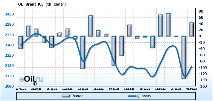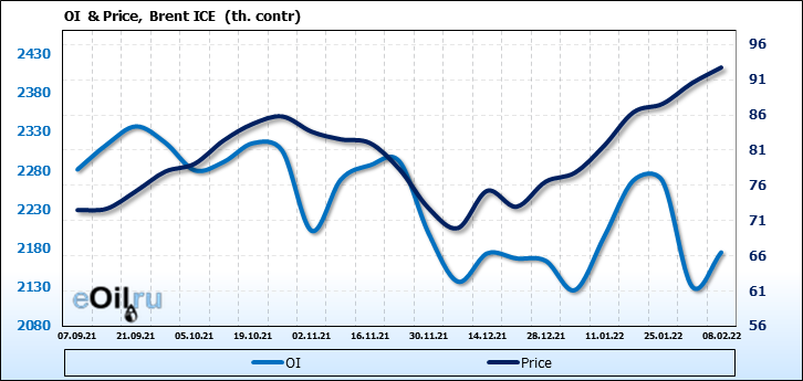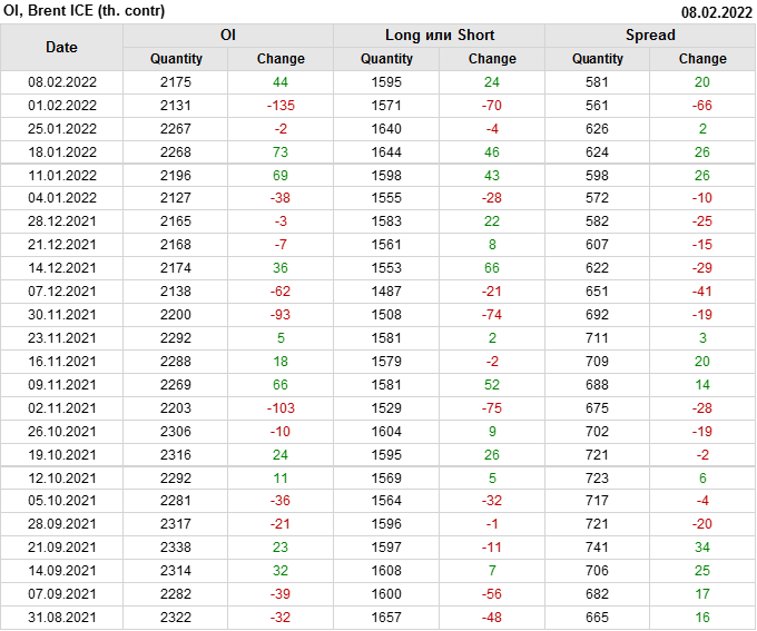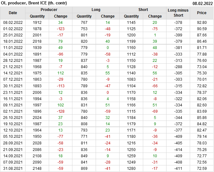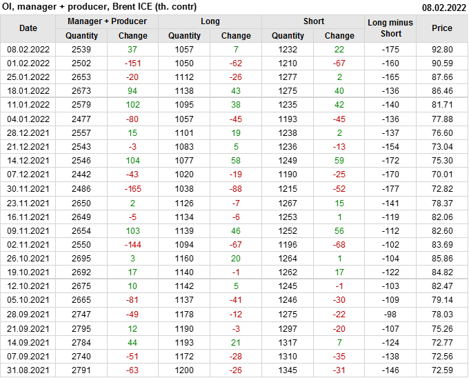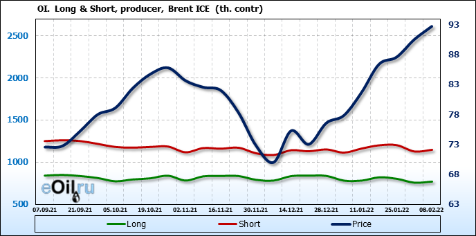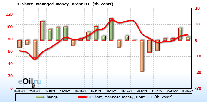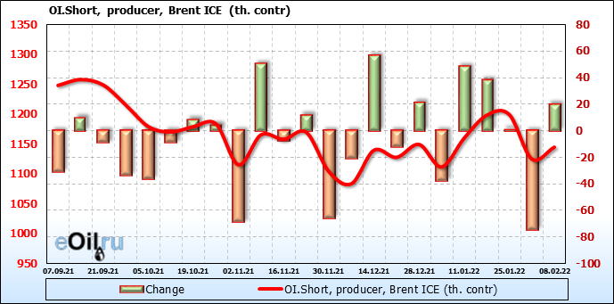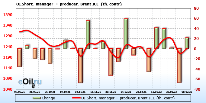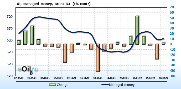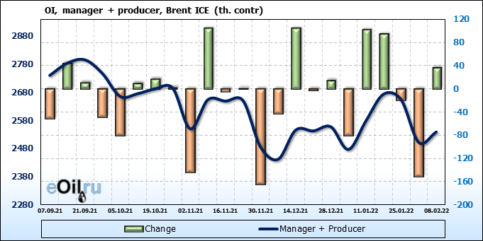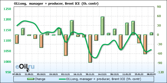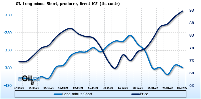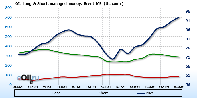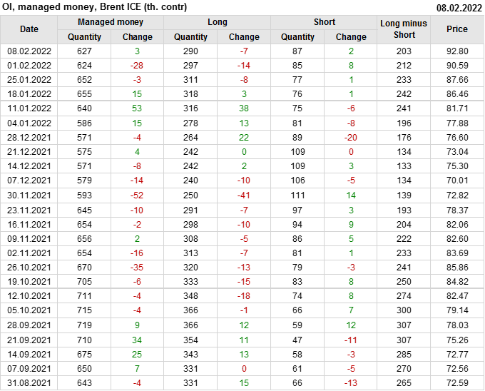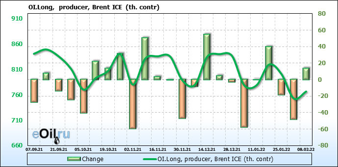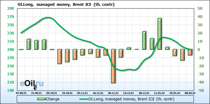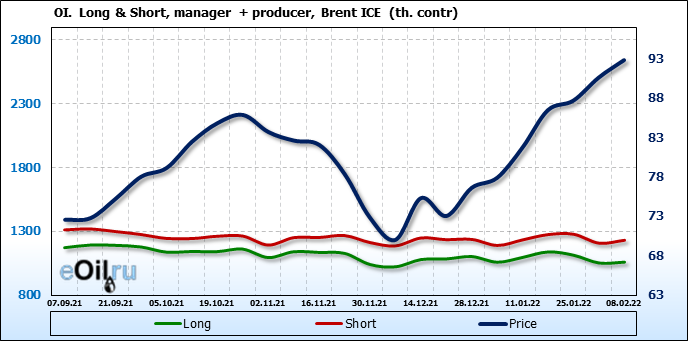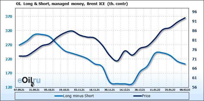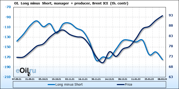 За прошедшую неделю, 02.02.22 — 08.02.22, разница между длинными и короткими позициями управляющих сократилась на 9.3 тыс. контрактов. В тоже время, цена выросла на 2.21 доллара.