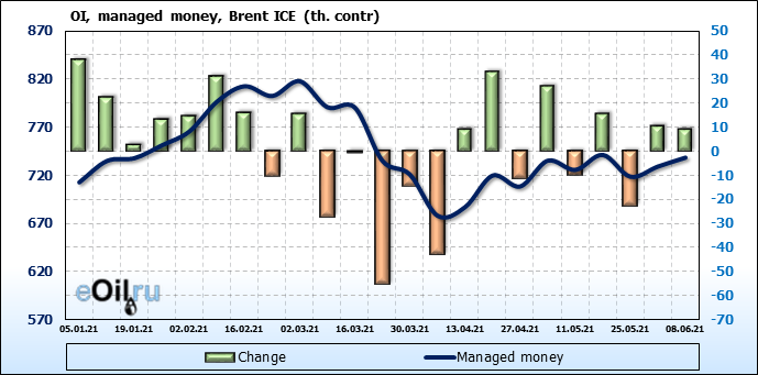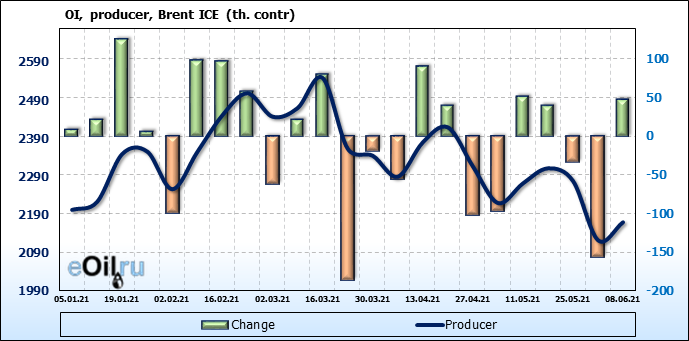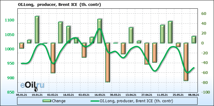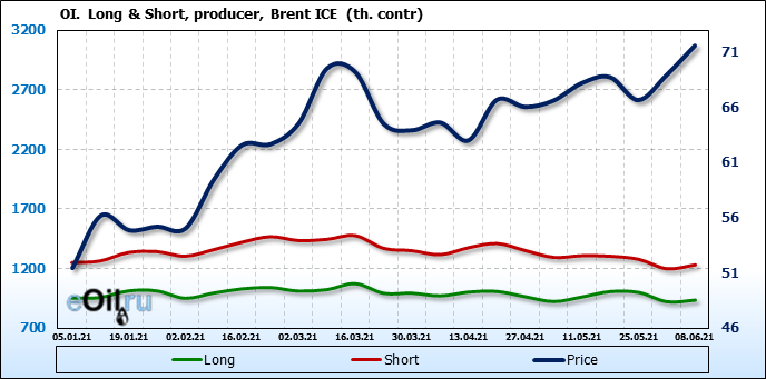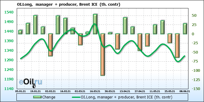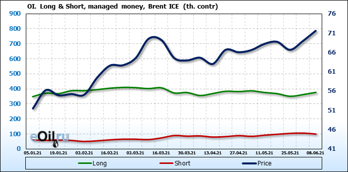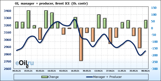 За прошедшую неделю, 02.06.21 — 08.06.21, разница между длинными и короткими позициями управляющих увеличилась на 21.3 тыс. контрактов. В тоже время, цена выросла на 2.67 доллара.
