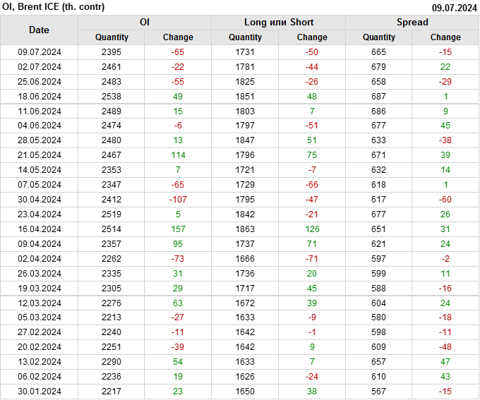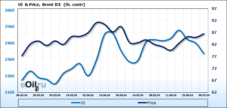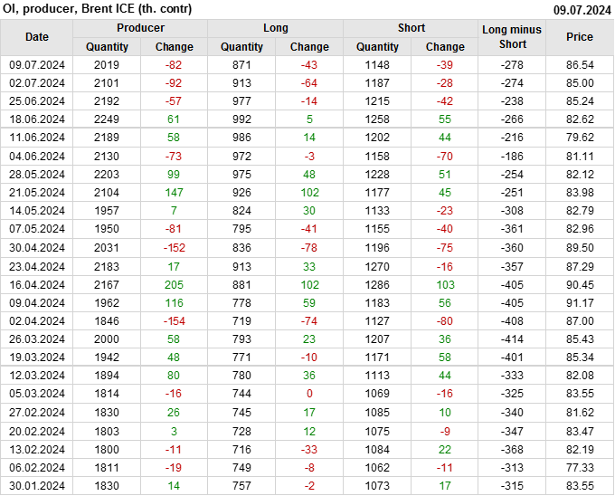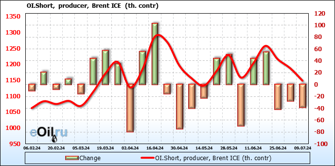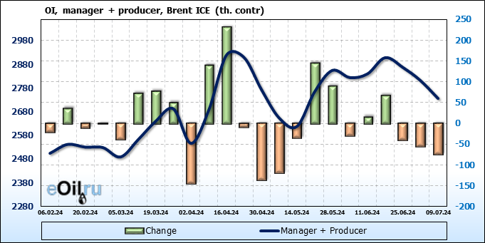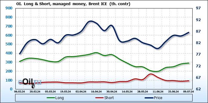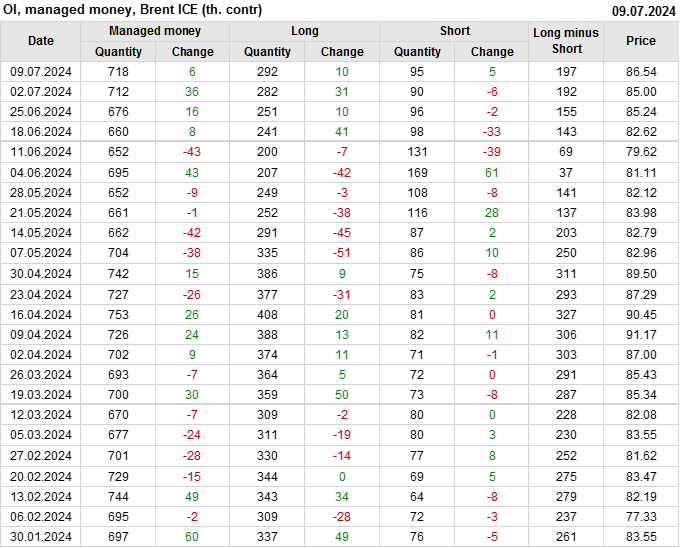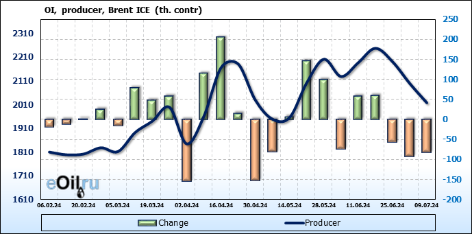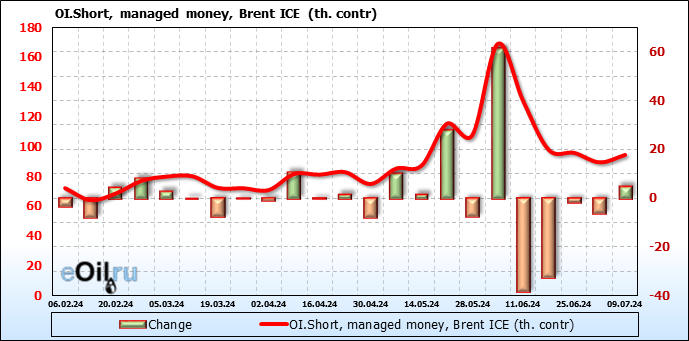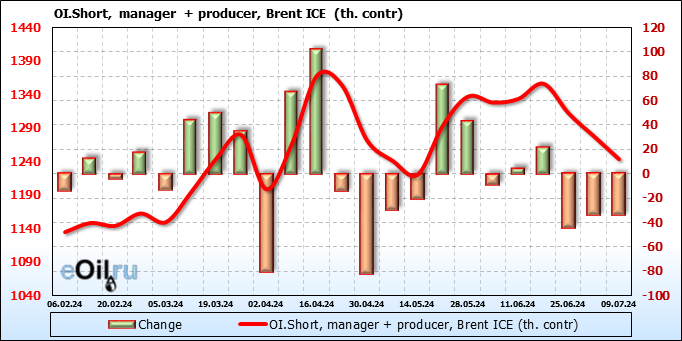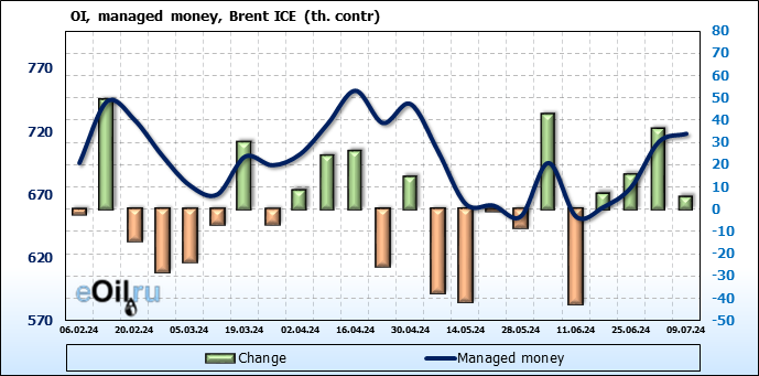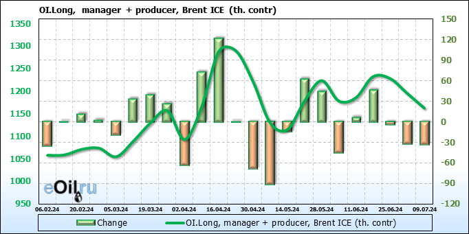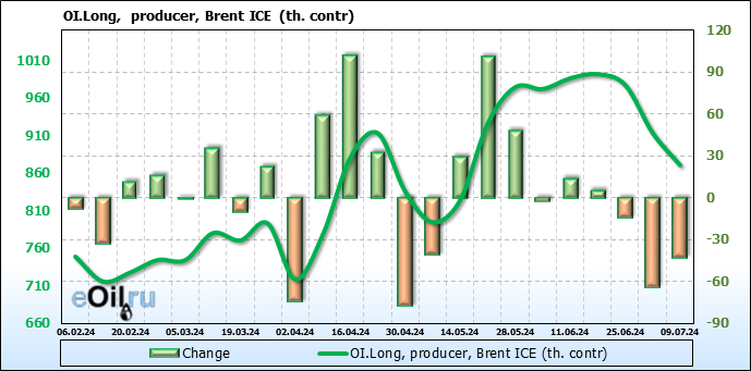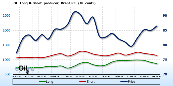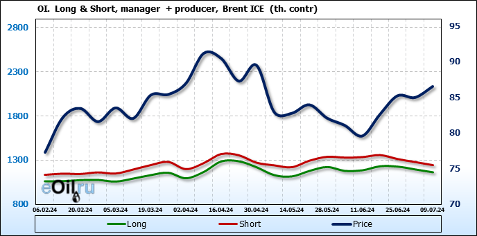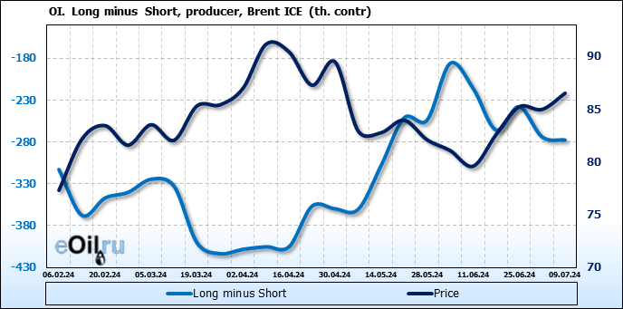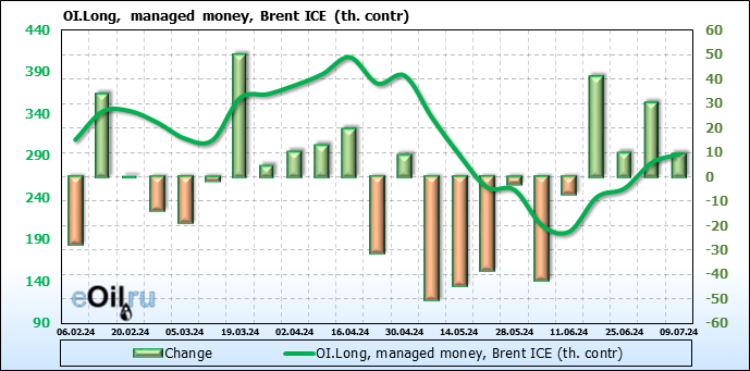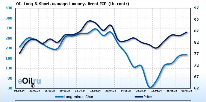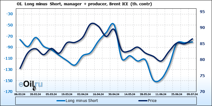 За прошедшую неделю, 03.07.24 — 09.07.24, разница между длинными и короткими позициями управляющих увеличилась на 5.1 тыс. контрактов. В тоже время, цена выросла на 1.54 доллара.