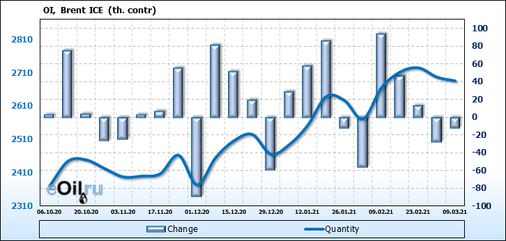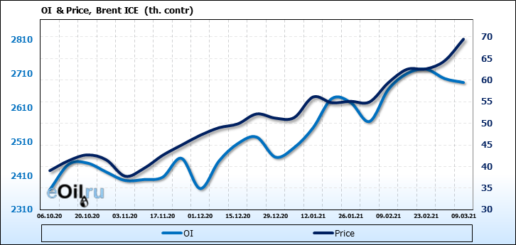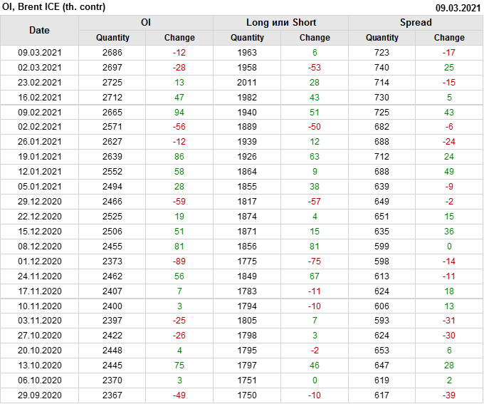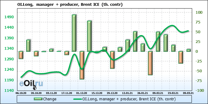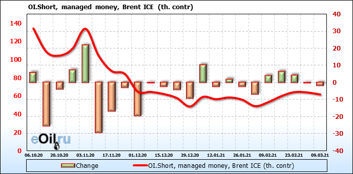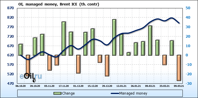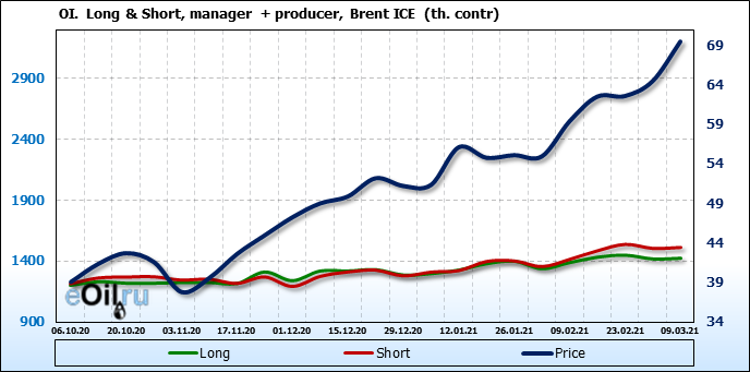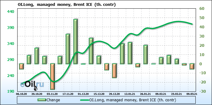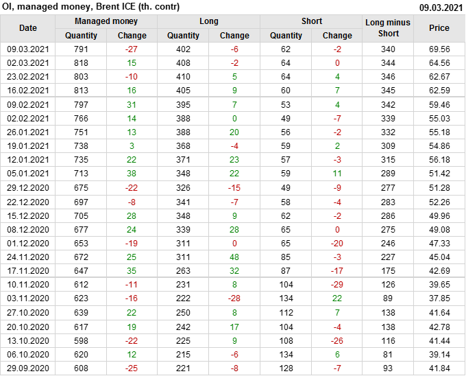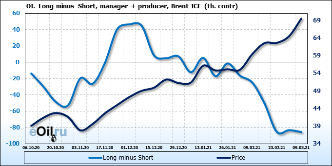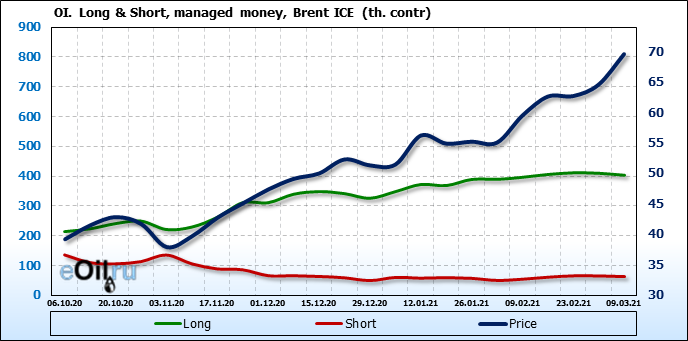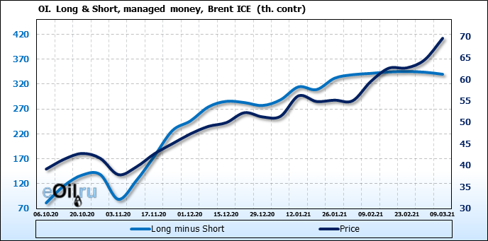 За прошлую неделю, 03.03.21 — 09.03.21, разница между длинными и короткими позициями управляющих упала на 4 тыс. контрактов. В тоже время, цена выросла на 5 доллара. Управляющие не горят желанием покупать, что заставляет нас рассуждать о потери доверия к тенденции со стороны быков — спекулянтов. Рынок становится более тонким. Без прихода свежих объемов, толкать цену вверх скоро будет некому.