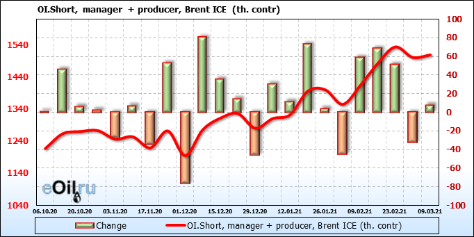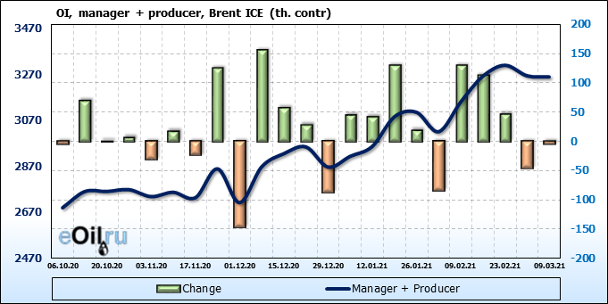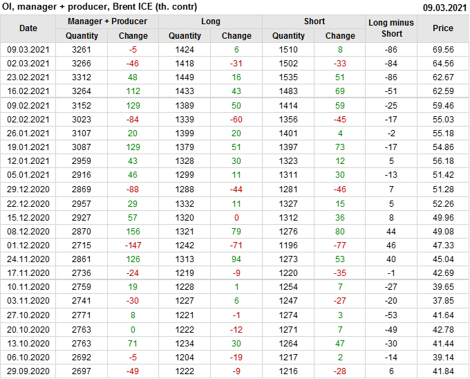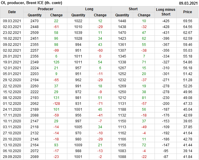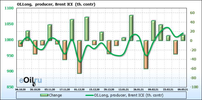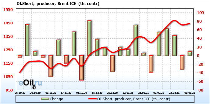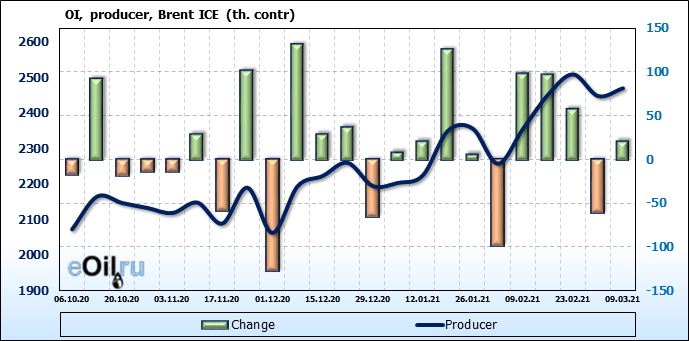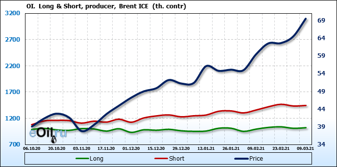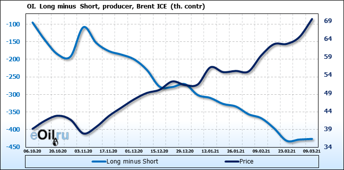 За прошлую неделю, 03.03.21 — 09.03.21, разница между длинными и короткими позициями производителей выросла на 2 тыс. контрактов. В тоже время, цена выросла на 5 доллара. Производители не торопятся наращивать продажи, предполагая, что возможен рост цены в ближайшее время.
