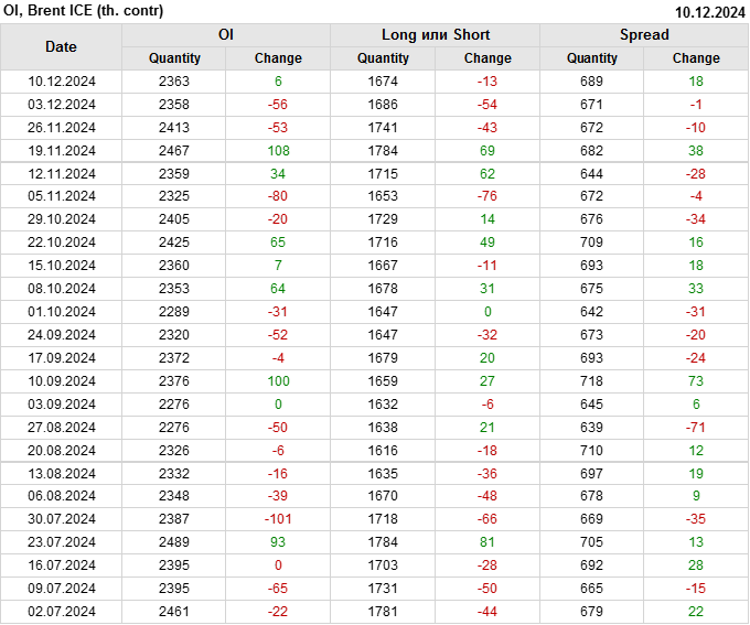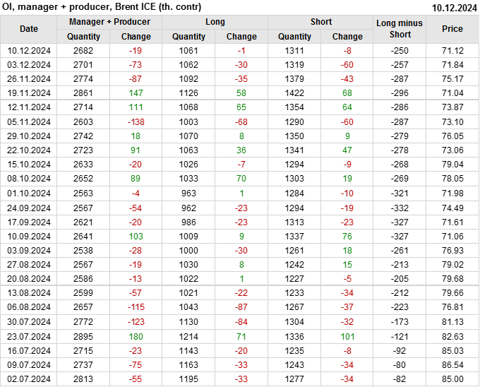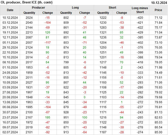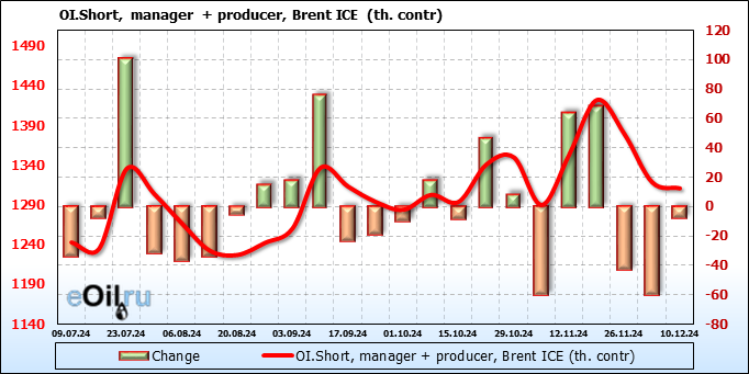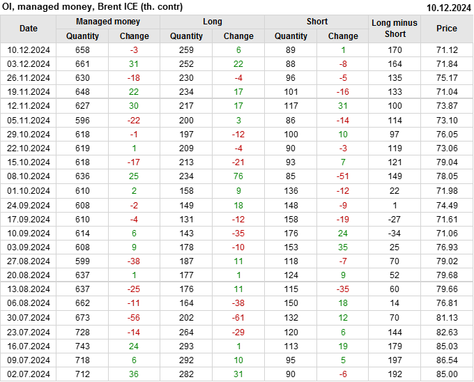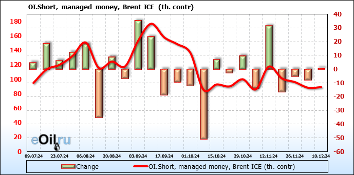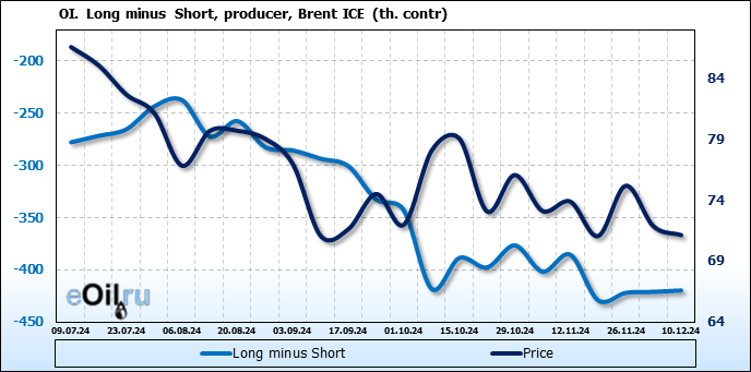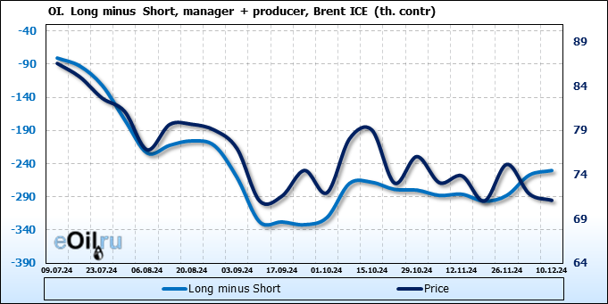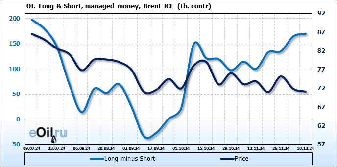 За прошедшую неделю, 04.12.24 — 10.12.24, разница между длинными и короткими позициями управляющих увеличилась на 5.5 тыс. контрактов. В тоже время, цена упала на 0.72 доллара.