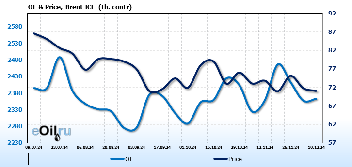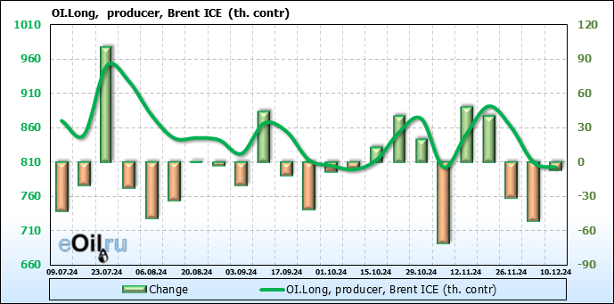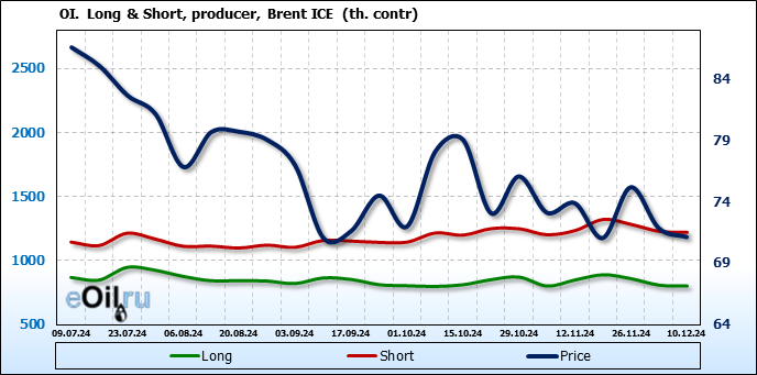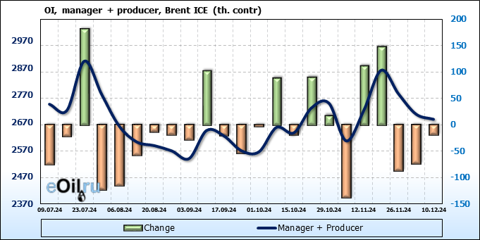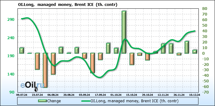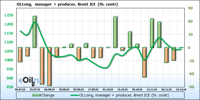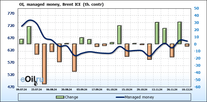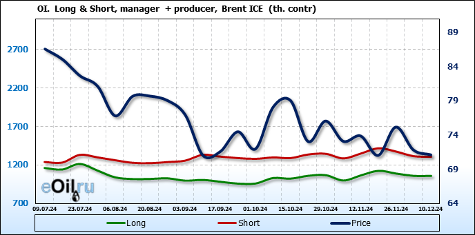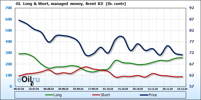 За прошедшую неделю, 04.12.24 — 10.12.24, разница между длинными и короткими позициями управляющих увеличилась на 5.5 тыс. контрактов. В тоже время, цена упала на 0.72 доллара.